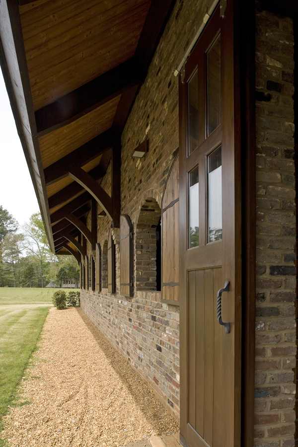 A heavy timber structure combined with reclaimed brick and cedar shingles wrap the exterior while tongue and groove decking skin the ceilings inside the barn. Tractors and farm equipment are housed in a separate shed structure that is clad in wood boards to match the main building.
