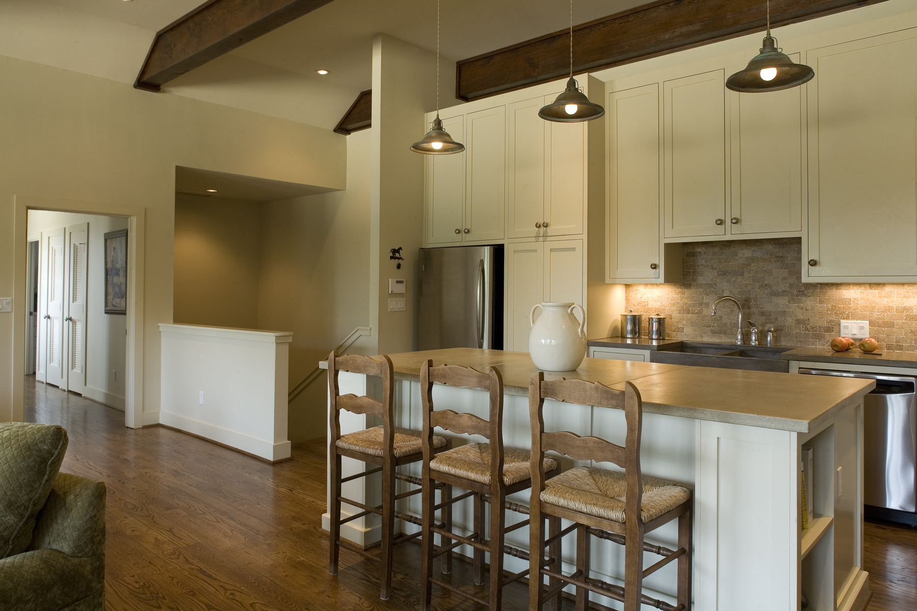 The owners of this residence wanted to have a connected house and barn. Surrounded by horse pastures, the barn-residence looks out over a hunter-jumper arena. The main level of the project is a barn with wash-rack, tack-room, feed-room and eight stalls. A large cupola and clerestory dormer windows flood the wide barn aisle with natural light. On the upper level a three bedroom residence has views out to the surrounding pastures and riding arena. A large porch at the main level provides outdoor living space and a viewing stand for the arena.
