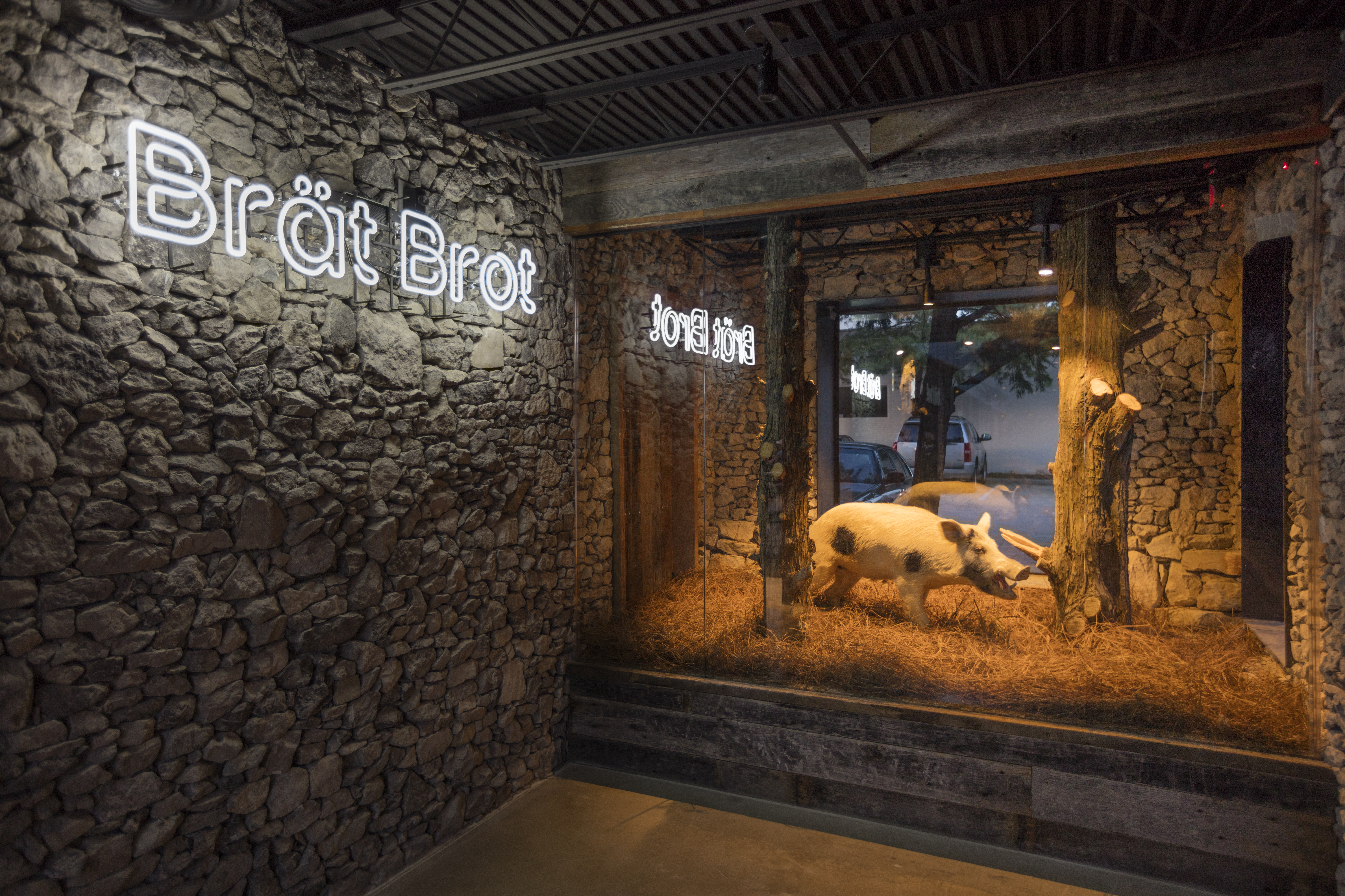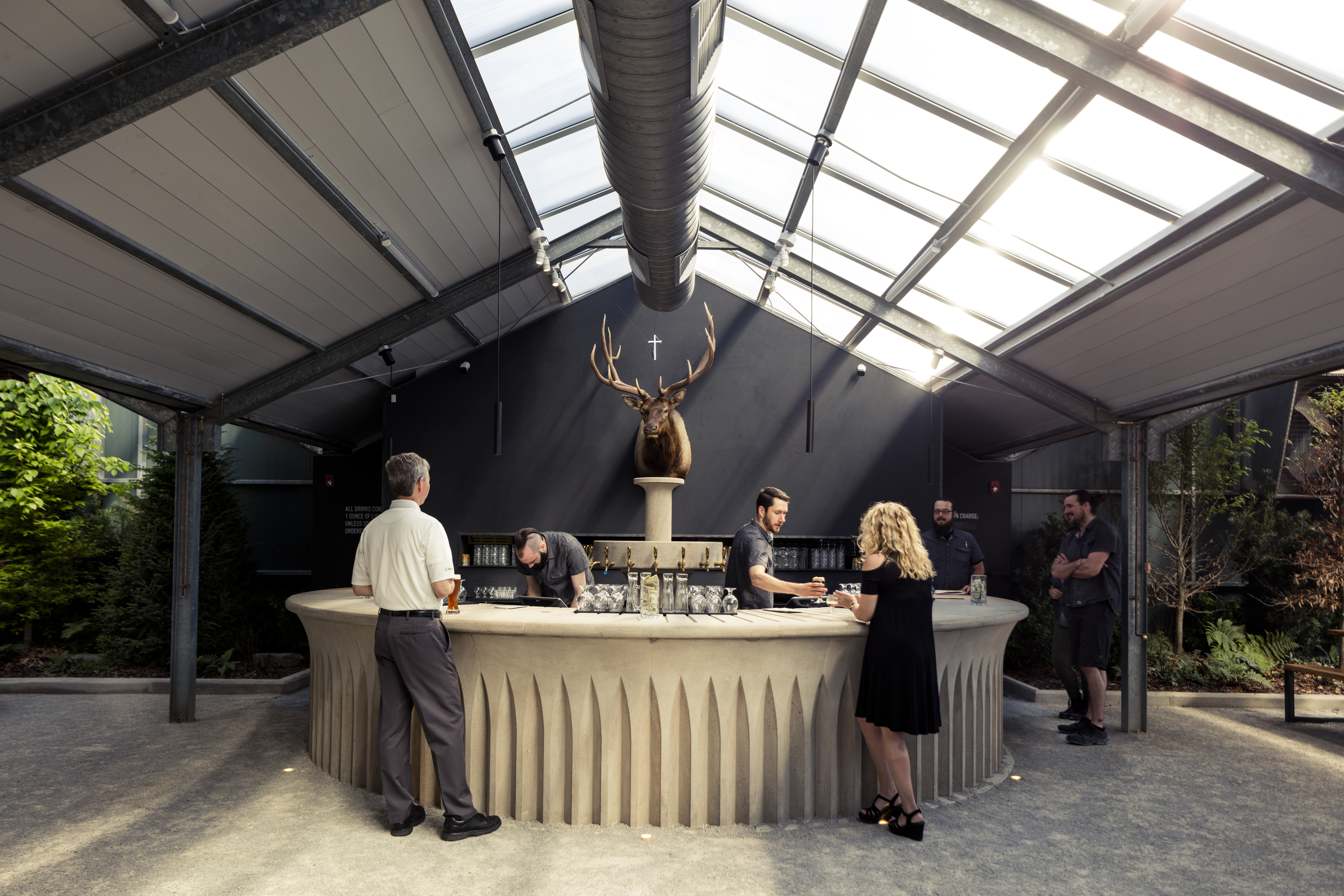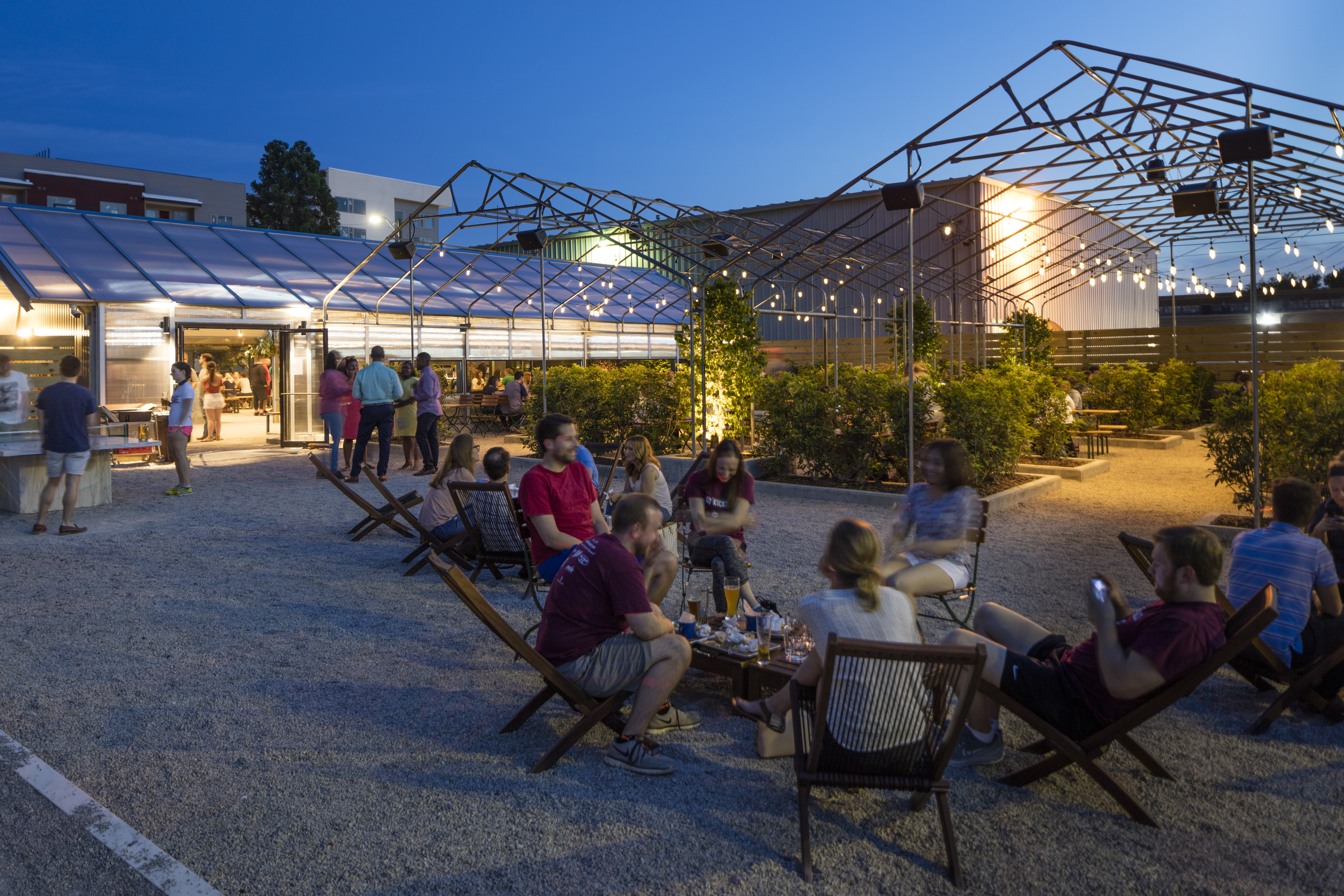 This project repurposes an abandoned garden center into a contemporary take on a traditional German style biergarten. The owner and design team acknowledged early in the process that the quirky existing building and location of the concept in a Birmingham, Alabama entertainment district posed some challenges to the development of an authentic biergarten atmosphere. Embracing these factors led them toward a concept that cleverly reused existing building elements such as an overly-exaggerated, stone-gabled entrance, the galvanized frame of a greenhouse, and hooped shade structures while treating them with contemporary finishes, insertions and landscape elements. Visitors are greeted by a juxtaposition of modern and kitsch—planar steel and wood features contrast sharply with displays of surrealist taxidermy and neon. The large, air-conditioned greenhouse ‘dining room’ is designed around an enormous carved limestone bar and beer ‘fountain’ that is set directly across from a large, concrete Honduran wood-fired grill, allowing the preparation of the food and beverage elements to become a sort of theater within the lush landscaping and common seating of the dining area. Beyond the dining room is a garden of hedged rooms beneath the hooped pole structure of a former shade garden. Tea olive hedges form private gathering spaces directly adjacent to a white marble ping-pong table and marble framed lawn bowling pitch.
