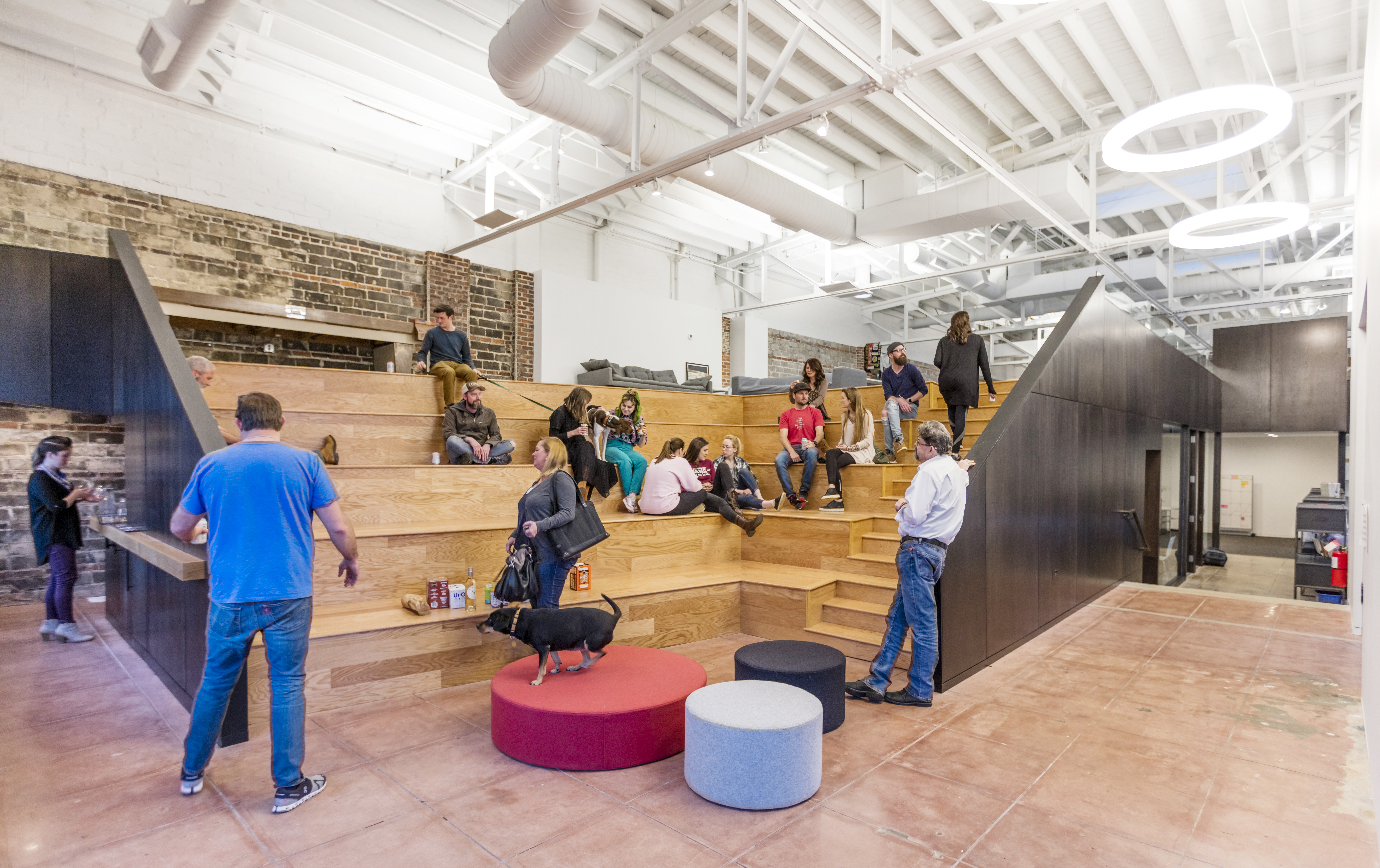 These nodes are arranged around, inside, and on top of an oak-clad volume that organizes space within the warehouse. The volume starts as amphitheater bleachers at the office’s entrance that rise to a mezzanine level offering relaxed, open desking. The body of the volume holds enclosed offices and support spaces that line two open bullpens framed by the volume’s voids. At its heart is a whiteboard clad “war room” that links the ground floor bullpens and offices, symbolizing the agency’s creative and collaborative core. The material palate and color schemes are relatively simple, neutral and high contrast, using broad swaths of material and color as a backdrop to the lively, creative process particular to the agency’s work.