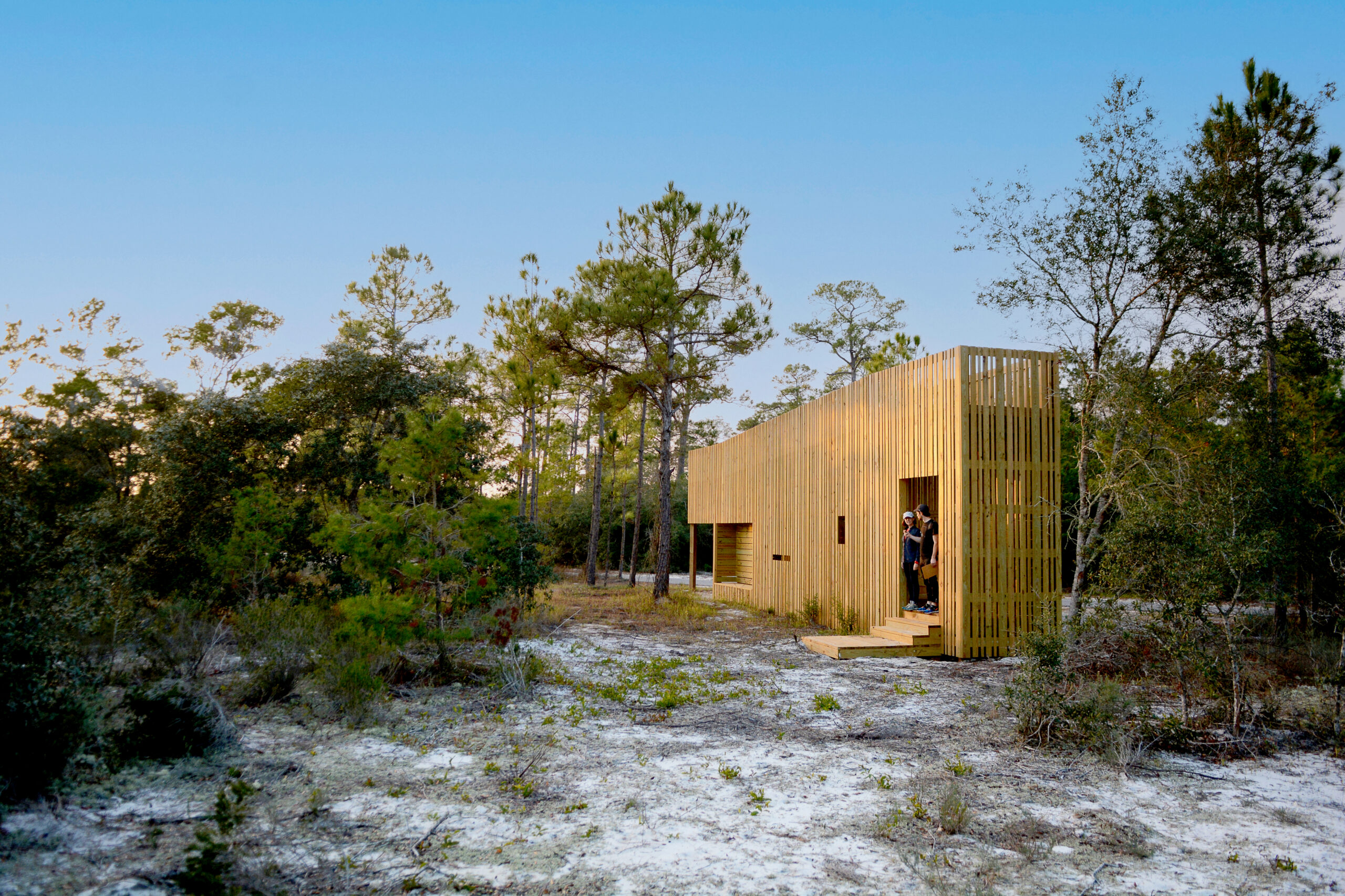 A hub for park visitors, K-12 students, rotating researchers, and park staff, the Gulf State Park Learning Campus rounds out the park’s offerings through its classrooms, laboratories, flexible meeting spaces and lodging options. Built on a previously developed area in an evergreen forest, the Campus demonstrates sustainable building practices and cultivates stewardship through interactive environmental programming. Site design of the Campus encourages visitors to park the car and use a pedestrian core, creating various experiences amid native longleaf pines and live oaks. The Student Lodge, equipped with 64 bunk beds and 2 private rooms, and a Community Restaurant are a short walk-in-the-woods away from Classrooms and a 200-seat Auditorium, the Park’s primary learning destinations for exhibits and formal research. Connected by boardwalks and characterized by screened porches nestled under the trees, the classrooms provide learning opportunities everywhere.