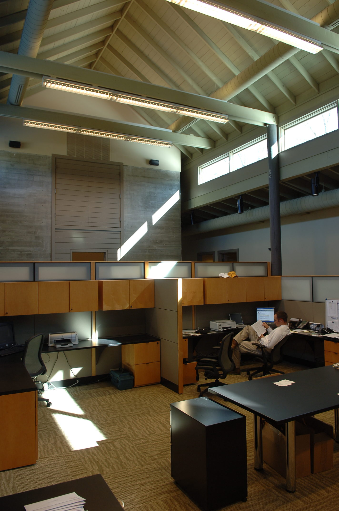 The two buildings are oriented on the site to take advantage of passive shading. Private offices are arranged around a central double-height space with clerestory windows that provide day-lighting to the inner portions of the building. Centrally located in the building is a cast-in-place tornado shelter that houses the bathrooms and copy room. Polished concrete floors, exposed wood framing, and wood siding provide an honest palette of materials on the interior.