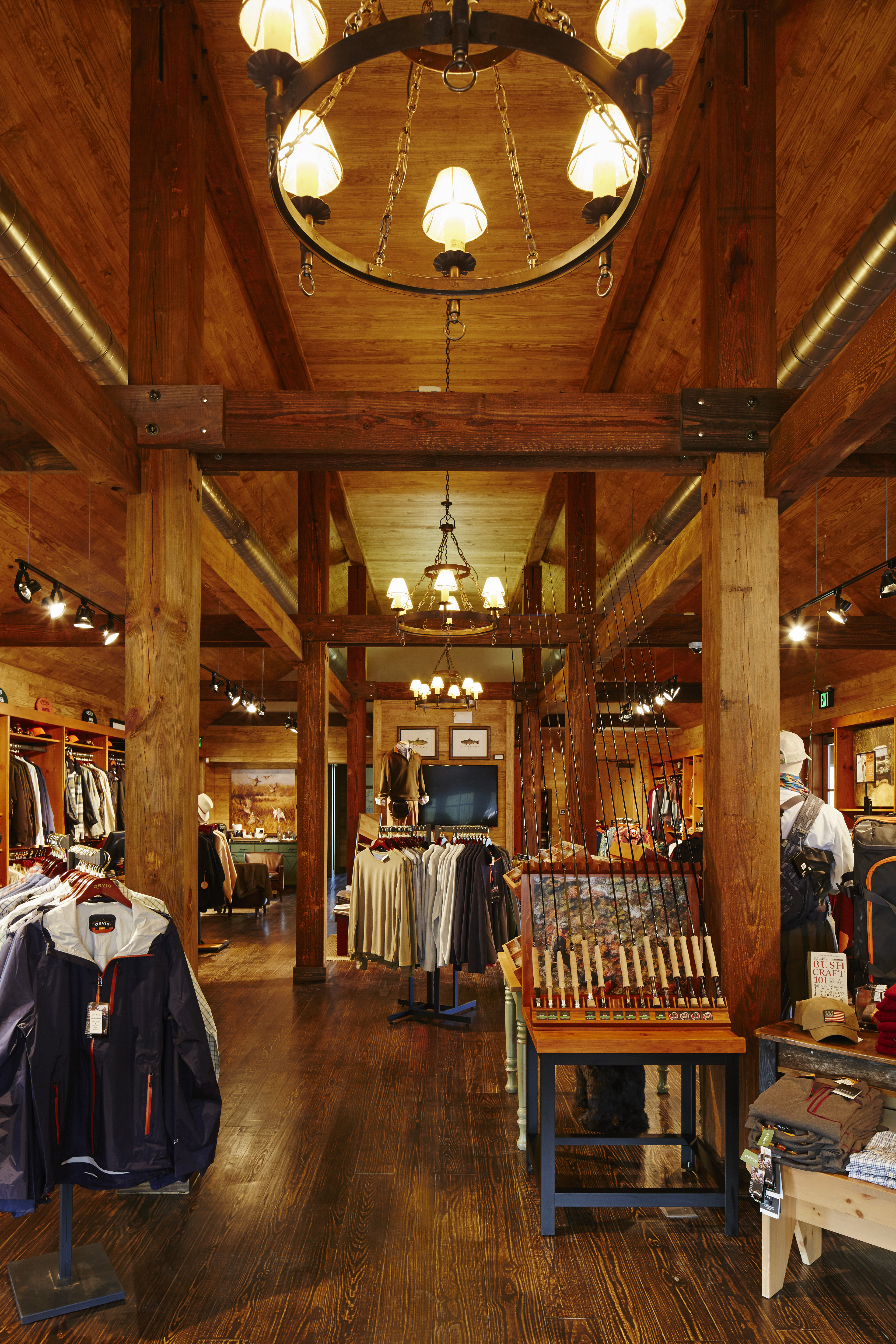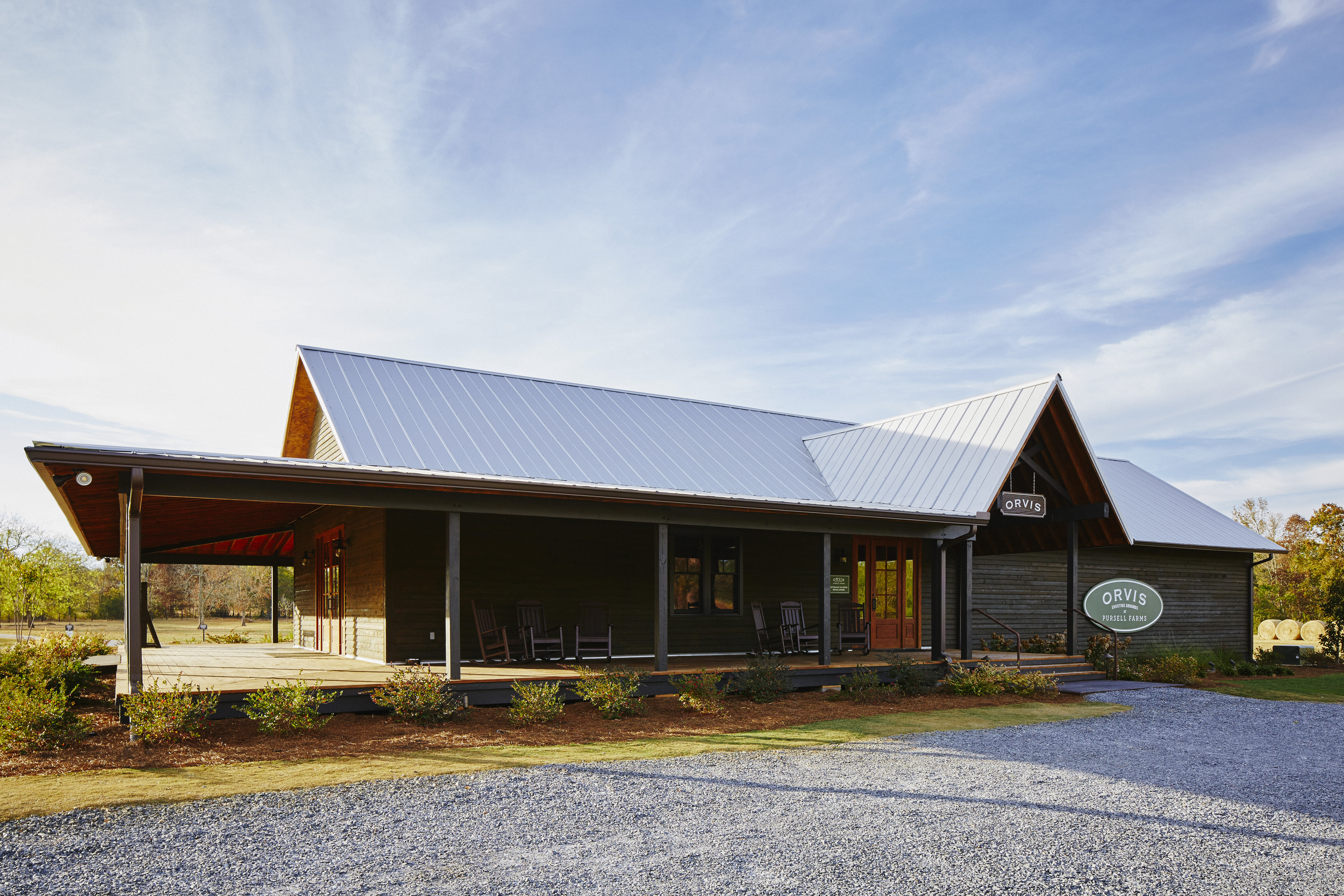 The new building is both an Orvis retail shop and a home-base for the Orvis Shooting Grounds. Inside, heart pine beams and columns boast highly detailed timber joinery. Hunting, sporting clays, or fly-fishing instruction takes place in an indoor classroom before groups head to the grounds for activities.
