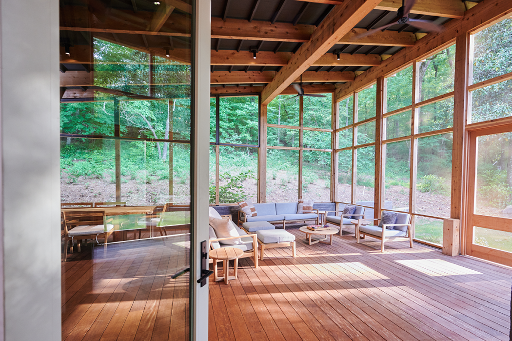 The renovation of this 1950’s brick rancher in Leeds, Alabama is designed to connect to the surrounding forest through large expanses of glass, a gracious screen porch, and welcoming entry terraces. The new spaces sit within the original footprint, reducing site disturbance and retaining the mature forest close to the house.