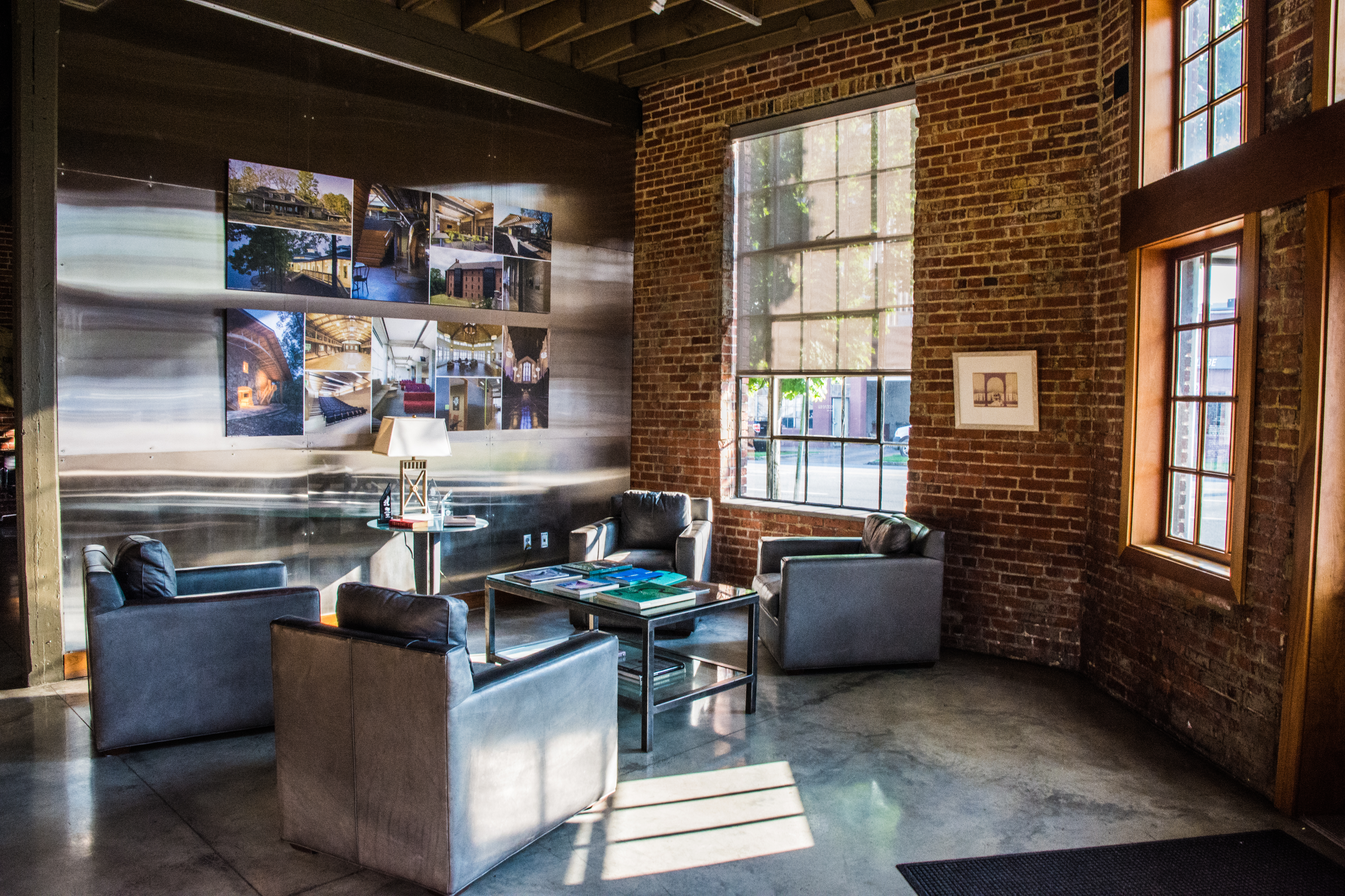 The connected community space, SawWorks Studio, was originally Birmingham Stave and Saw Works. In 1998 the building was purchased along with the Birmingham Publishing buildings adjacent to it. The space was renovated and a loft apartment added over a new conference room. Natural light flows from both sides through oversized existing steel and glass windows. The existing structure is left exposed in the space complementing the original brick walls.