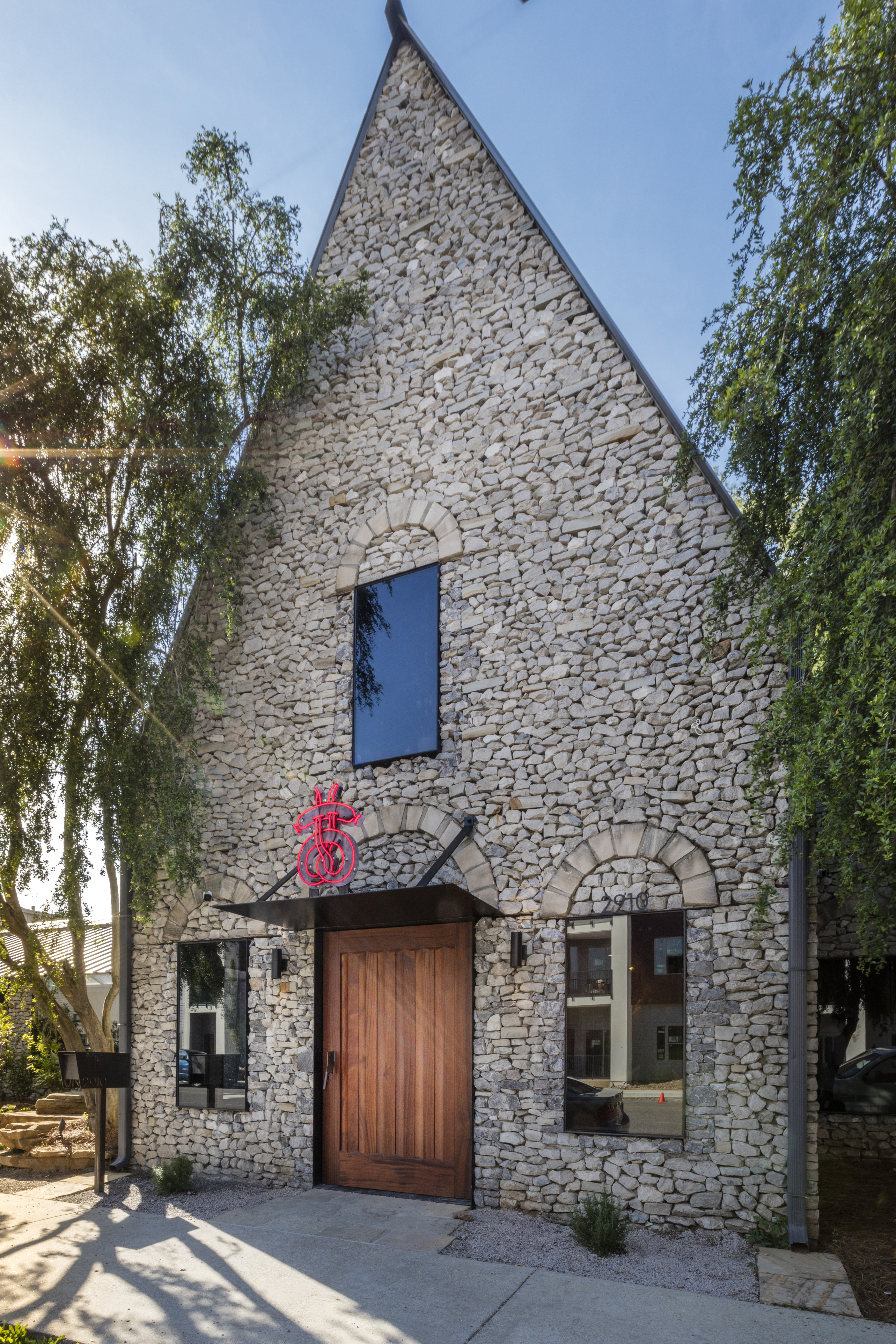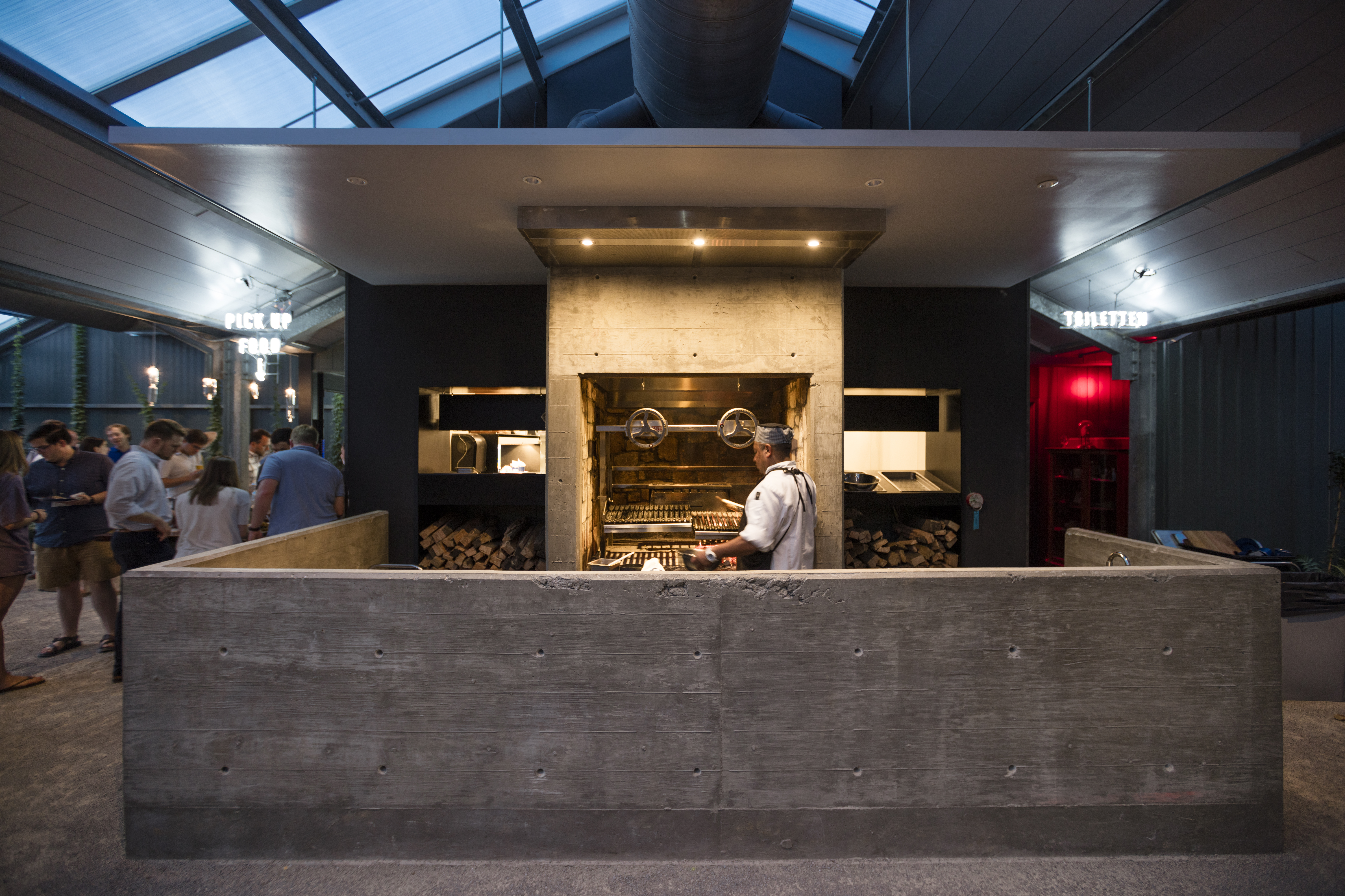 Visitors are greeted by a juxtaposition of modern and kitsch—planar steel and wood features contrast sharply with displays of surrealist taxidermy and neon. The large, air-conditioned greenhouse ‘dining room’ is designed around an enormous carved limestone bar and beer ‘fountain’ that is set directly across from a large, concrete Honduran wood-fired grill, allowing the preparation of the food and beverage elements to become a sort of theater within the lush landscaping and common seating of the dining area.