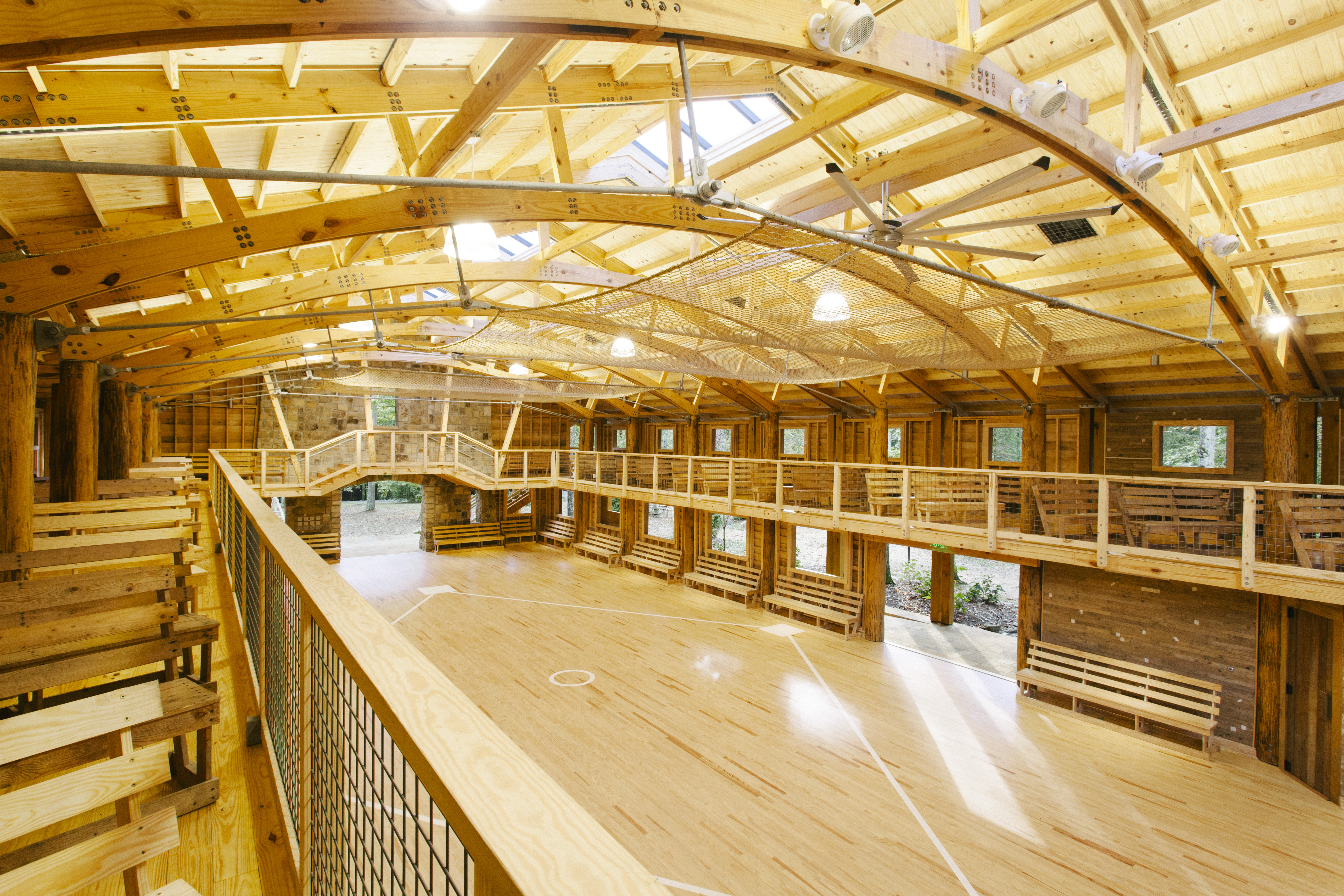 The design team goals focused on making a building to replace the existing 80 year-old gym and retaining 80 years of history, character and place with the new structure. The new gym is carefully sited and was constructed to protect and save existing trees. Trees that were removed were dropped, peeled, dried and reused for the main structural columns for the new building. Existing materials repurposed in the new building include: wood trusses into new doors and windows, wood flooring into new interior wall finishes, stonework.