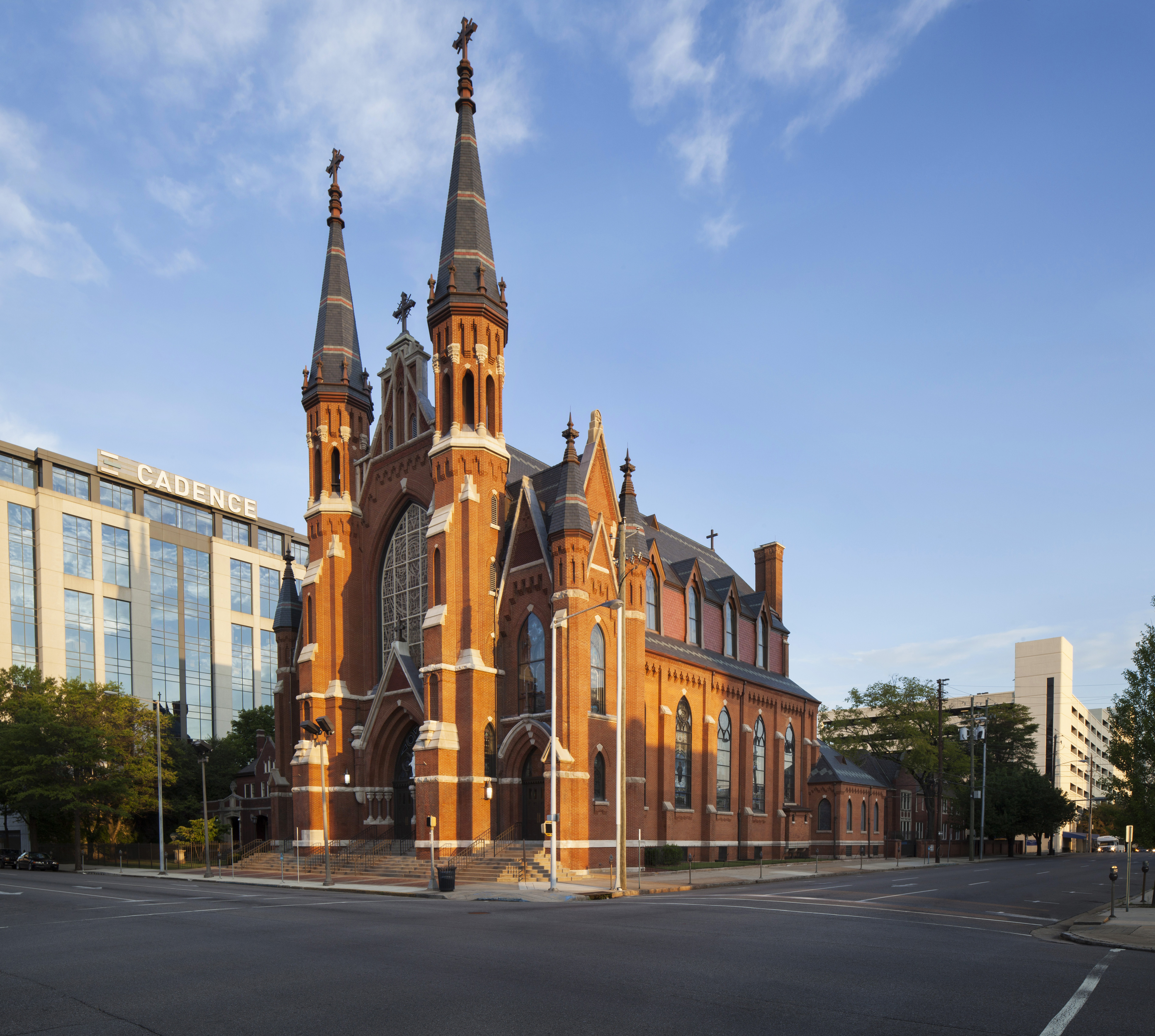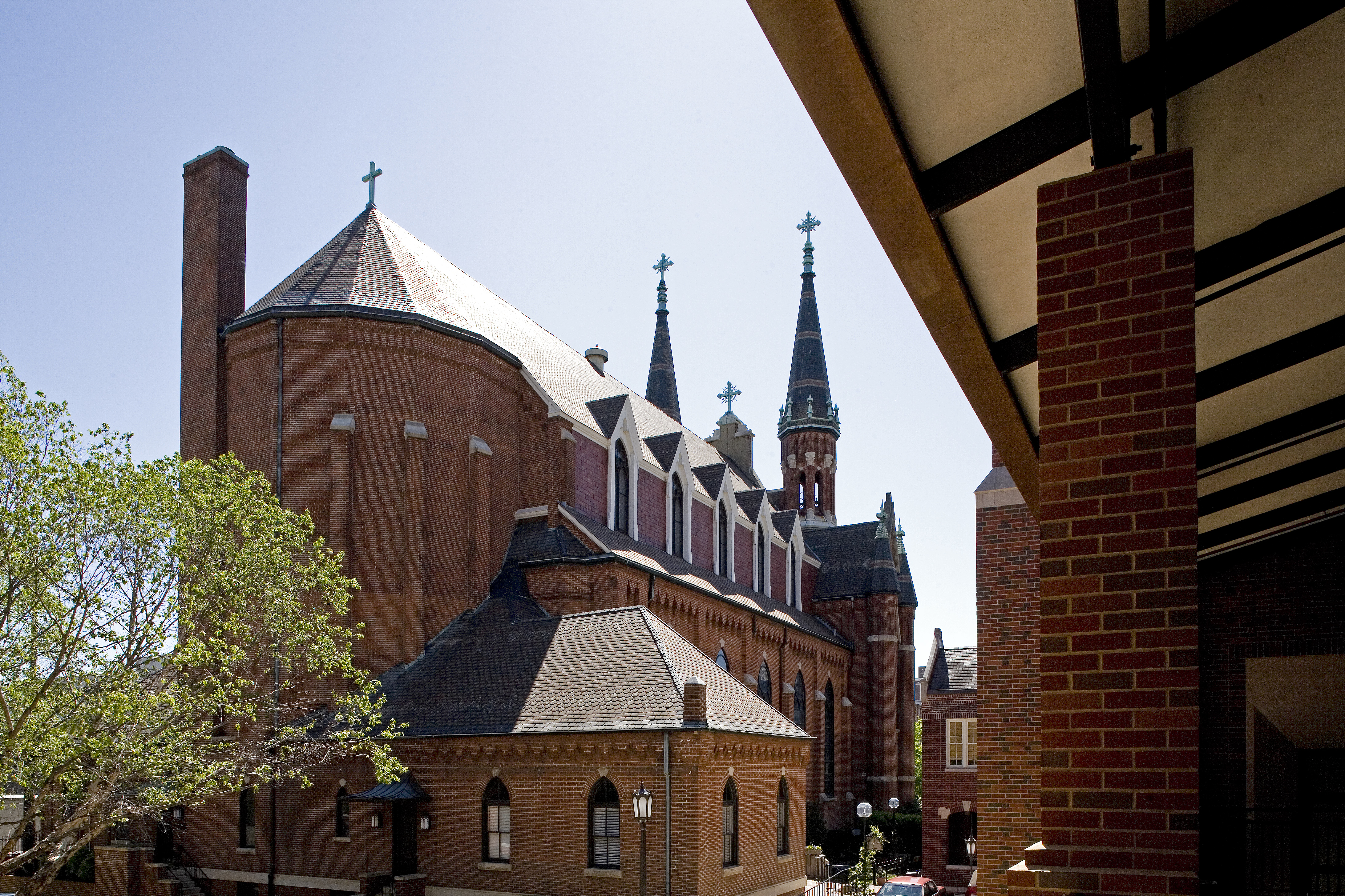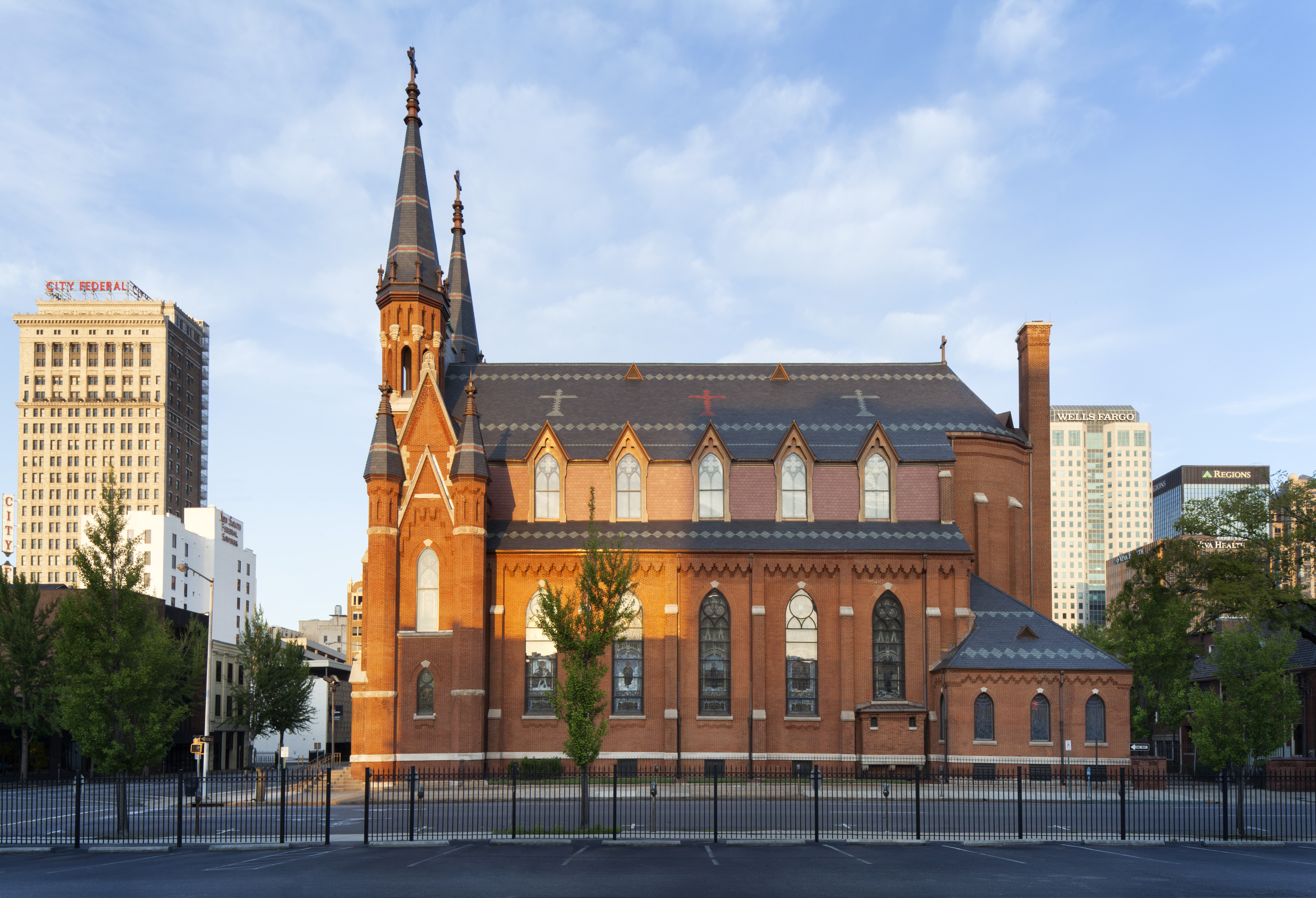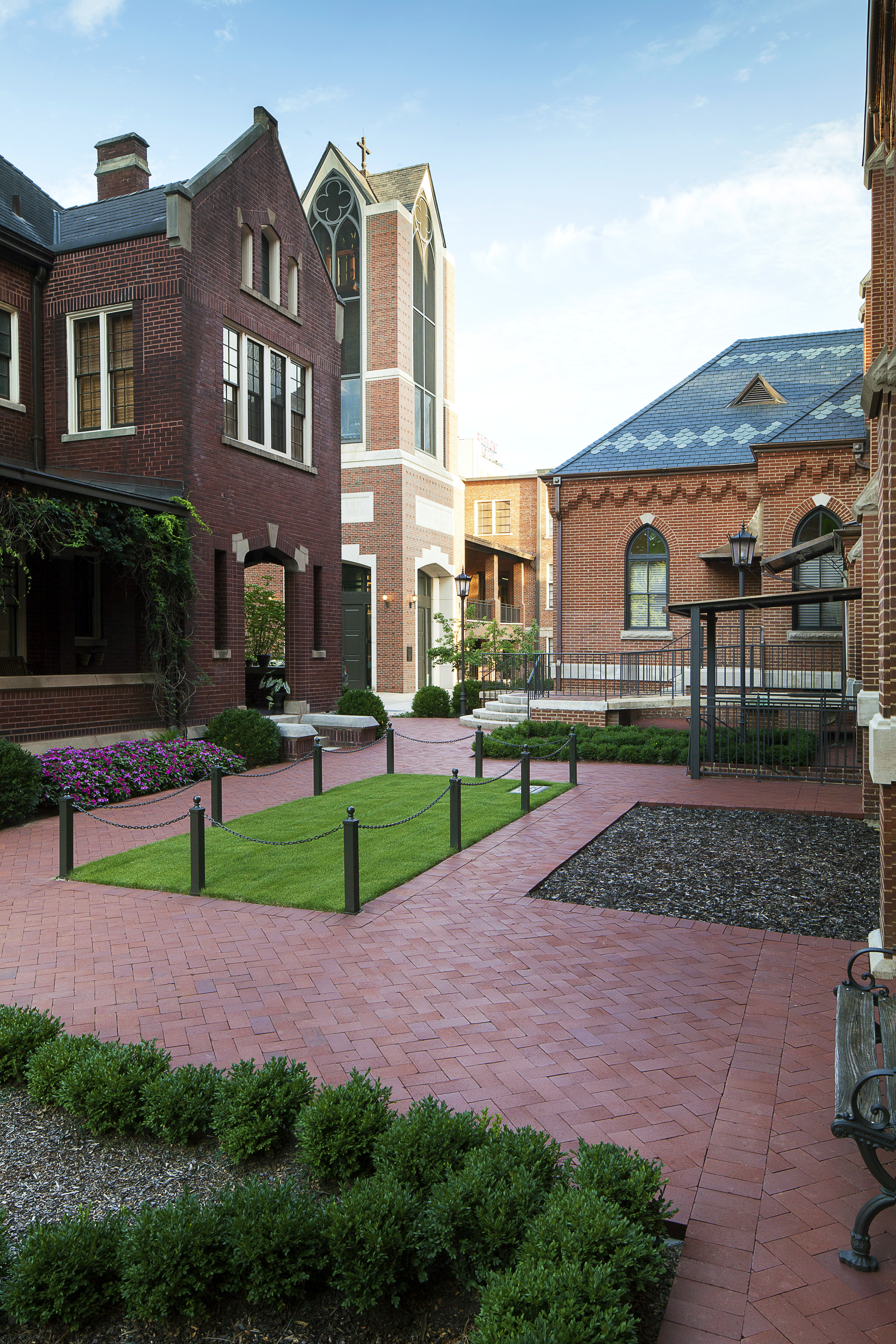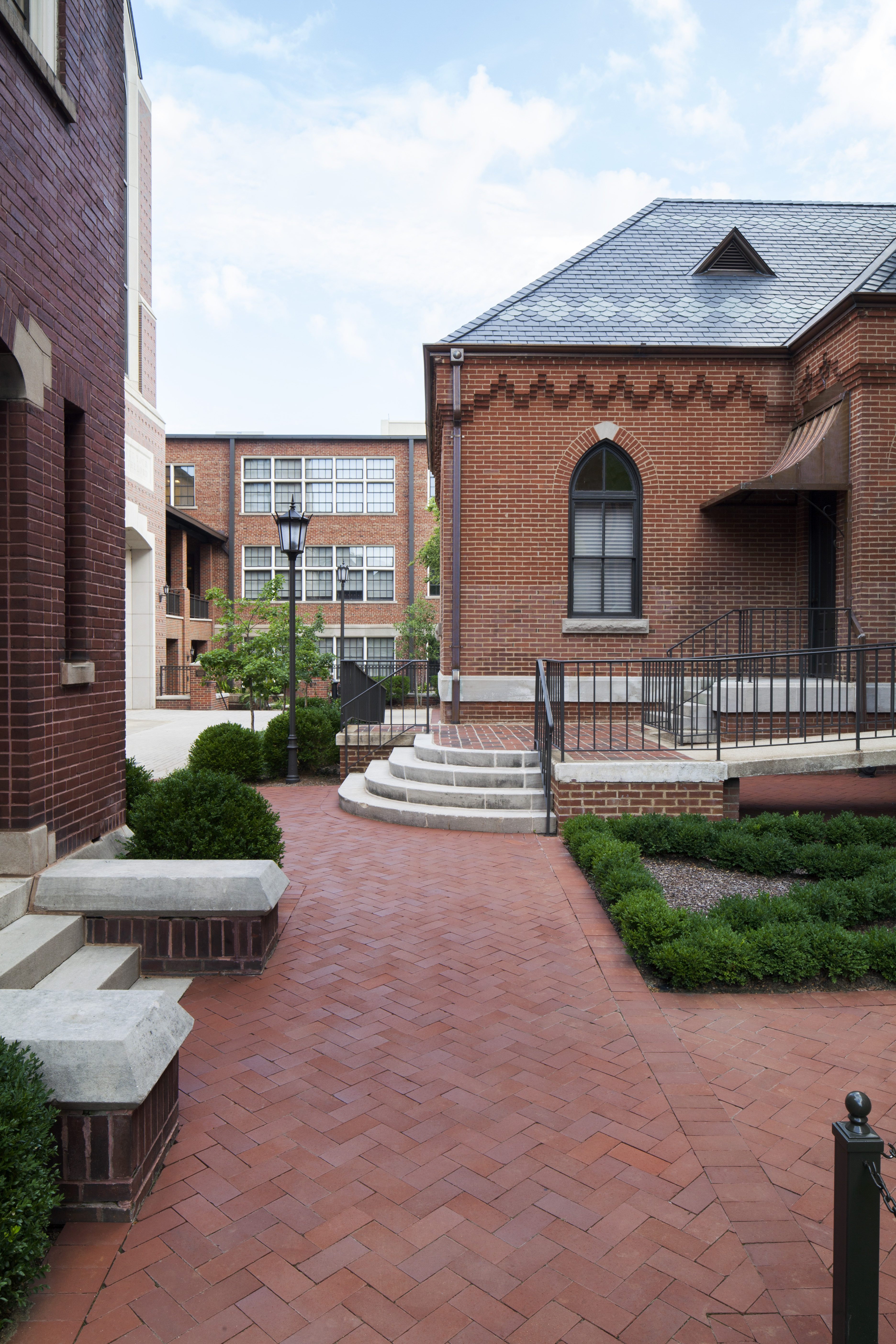 After over 120 + years of inspiring service to the Birmingham region, the Cathedral of Saint Paul required extensive restoration in order to prepare for the next 100 years. ArchitectureWorks assembled a team of experts in preservation technology to detail all aspects of the repair, replacement, and remediation work in a manner consistent with the historic quality of the building. Details were carefully considered to provide the greatest potential for the Cathedral’s continued life as important landmark in the Diocese of Birmingham in Alabama. The new polychrome slate roof was sourced from North American quarries in Canada and in the New York and Vermont slate valley. All of the copper flashings were replaced and many areas reconstructed in new metal where roof to wall flashing intersections had failed. The masonry restoration included a complete hand removal of the existing mortar and replacement mortar compatible with the historic brick. In order to better preserve the wood trim on the building, the dormer and cornice elements were clad in copper and vented to provide reduced maintenance. New drainage piping, as well as hardscape and landscaping, was installed in the courtyard between the Cathedral and the Rectory.