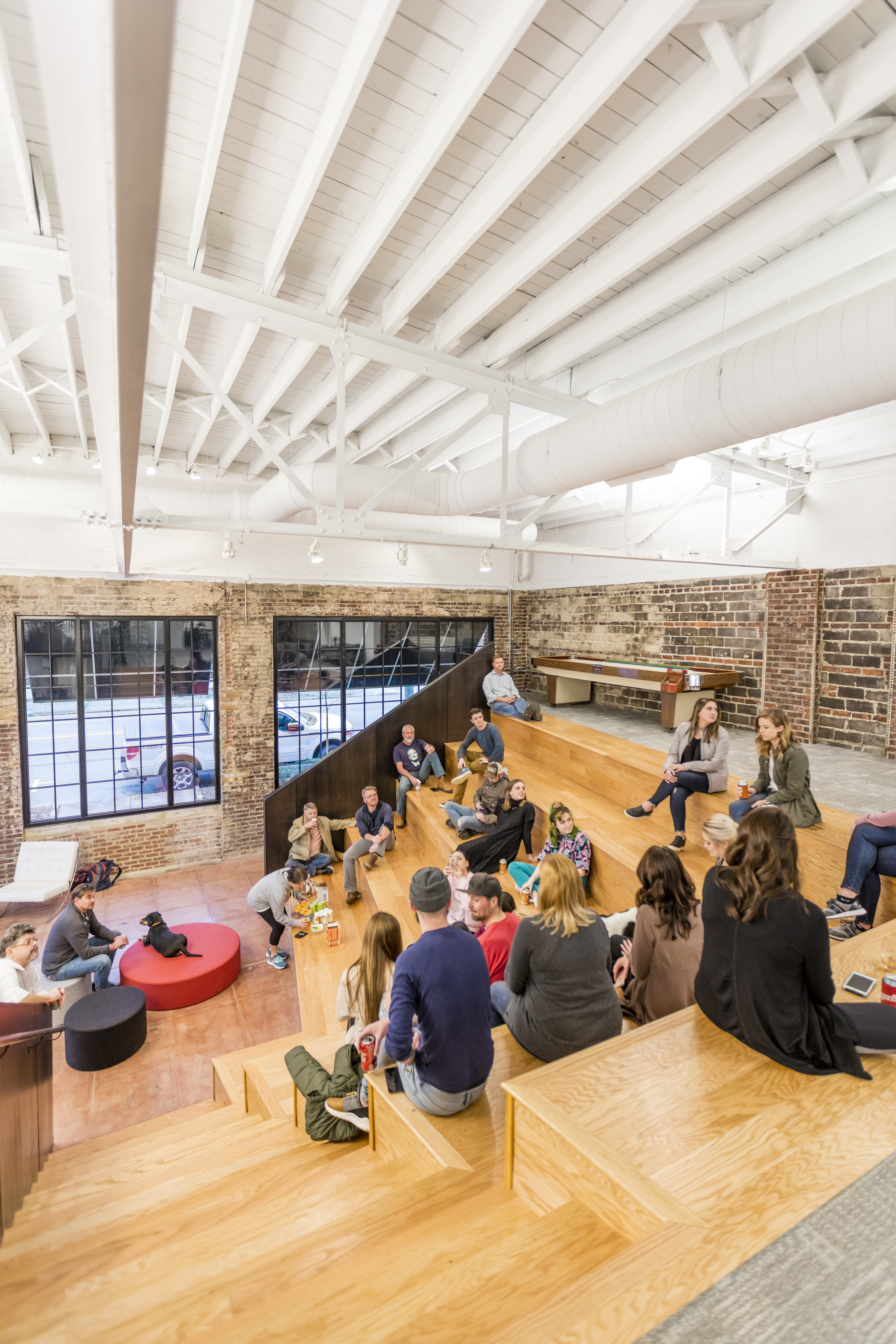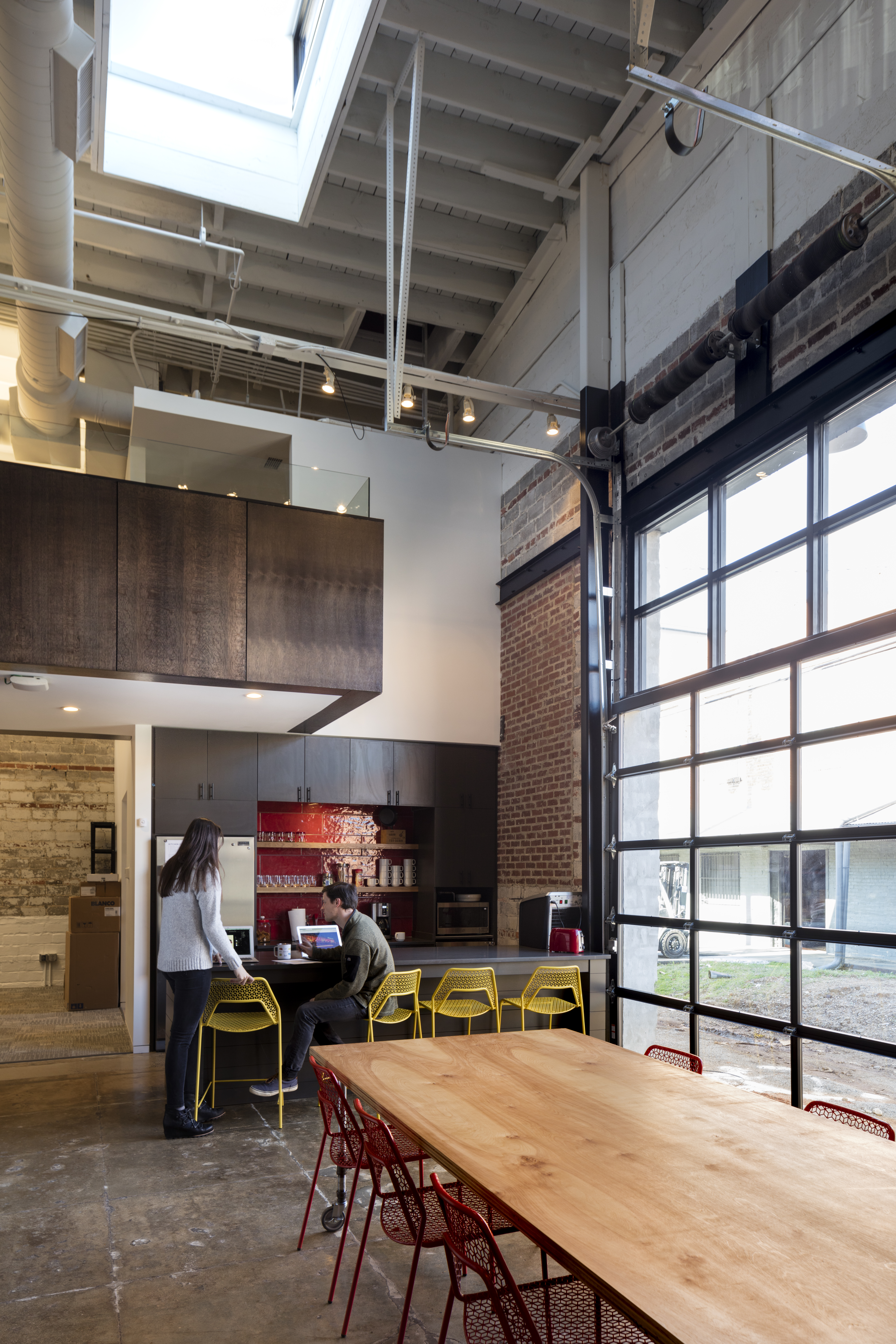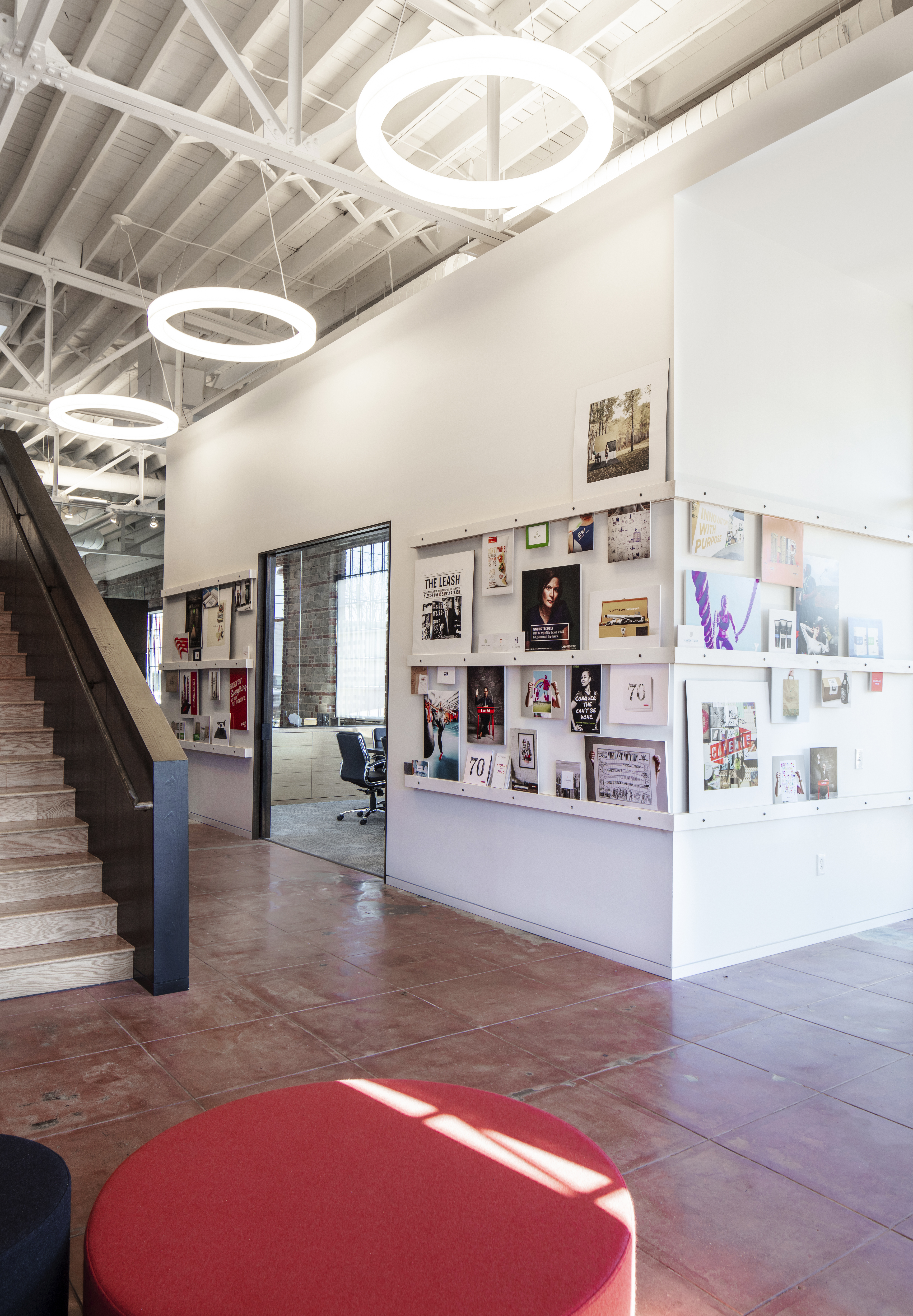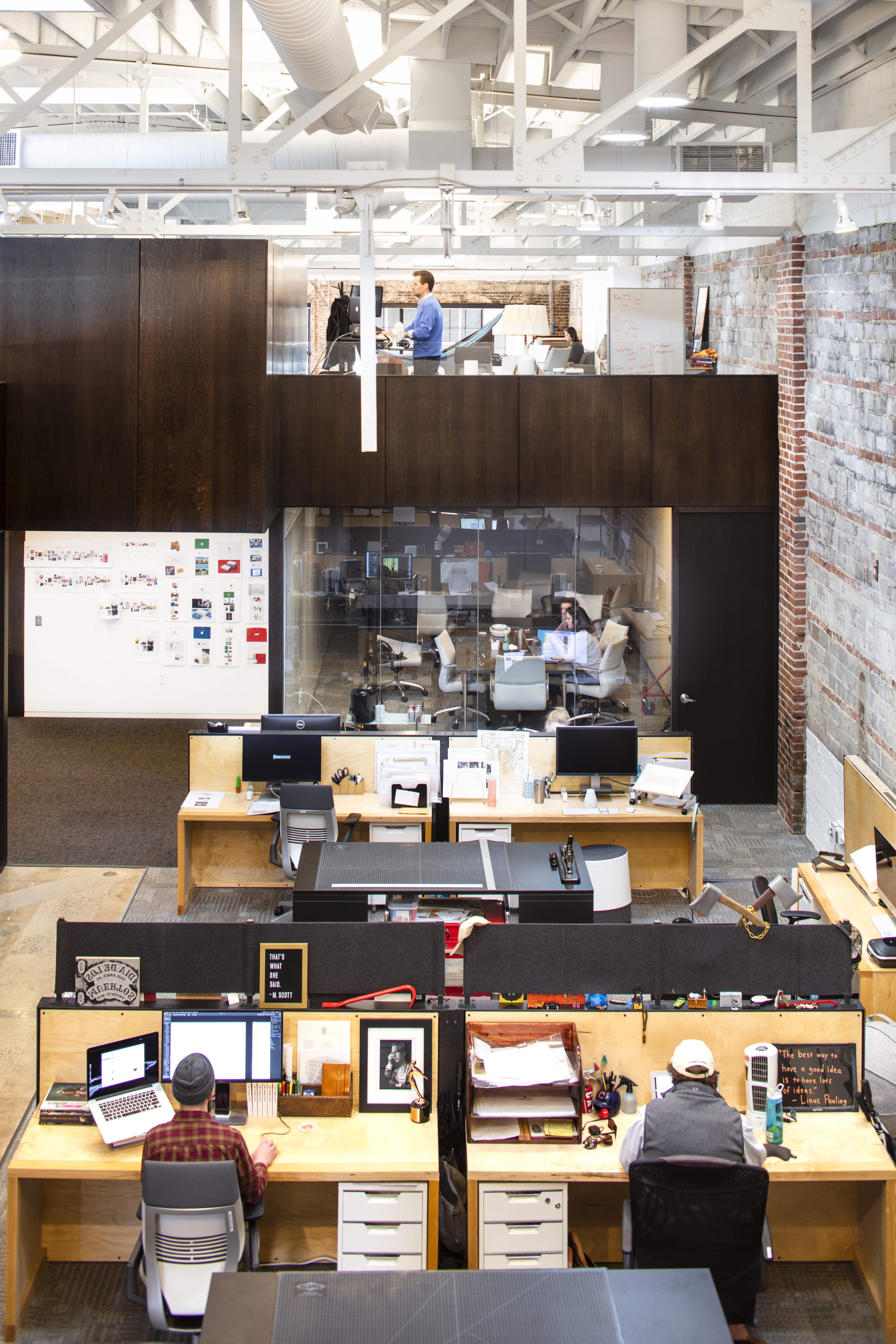 These nodes are arranged around, inside, and on top of an oak-clad volume that organizes space within the warehouse. The volume starts as amphitheater bleachers at the office’s entrance that rise to a mezzanine level offering relaxed, open desking. The body of the volume holds enclosed offices and support spaces that line two open bullpens framed by the volume’s voids. At its heart is a whiteboard clad “war room” that links the ground floor bullpens and offices, symbolizing the agency’s creative and collaborative core. The material palette and color schemes are relatively simple, neutral and high contrast, using broad swaths of material and color as a backdrop to the lively, creative process particular to the agency’s work. The imperfections and irregularities present in the space were embraced and incorporated into the design. Miscellaneous oddities from the building’s days as a service garage were left in the steel roof system and painted a uniform white to leave textural interest while echoes of past improvements were left on the brick interior walls.