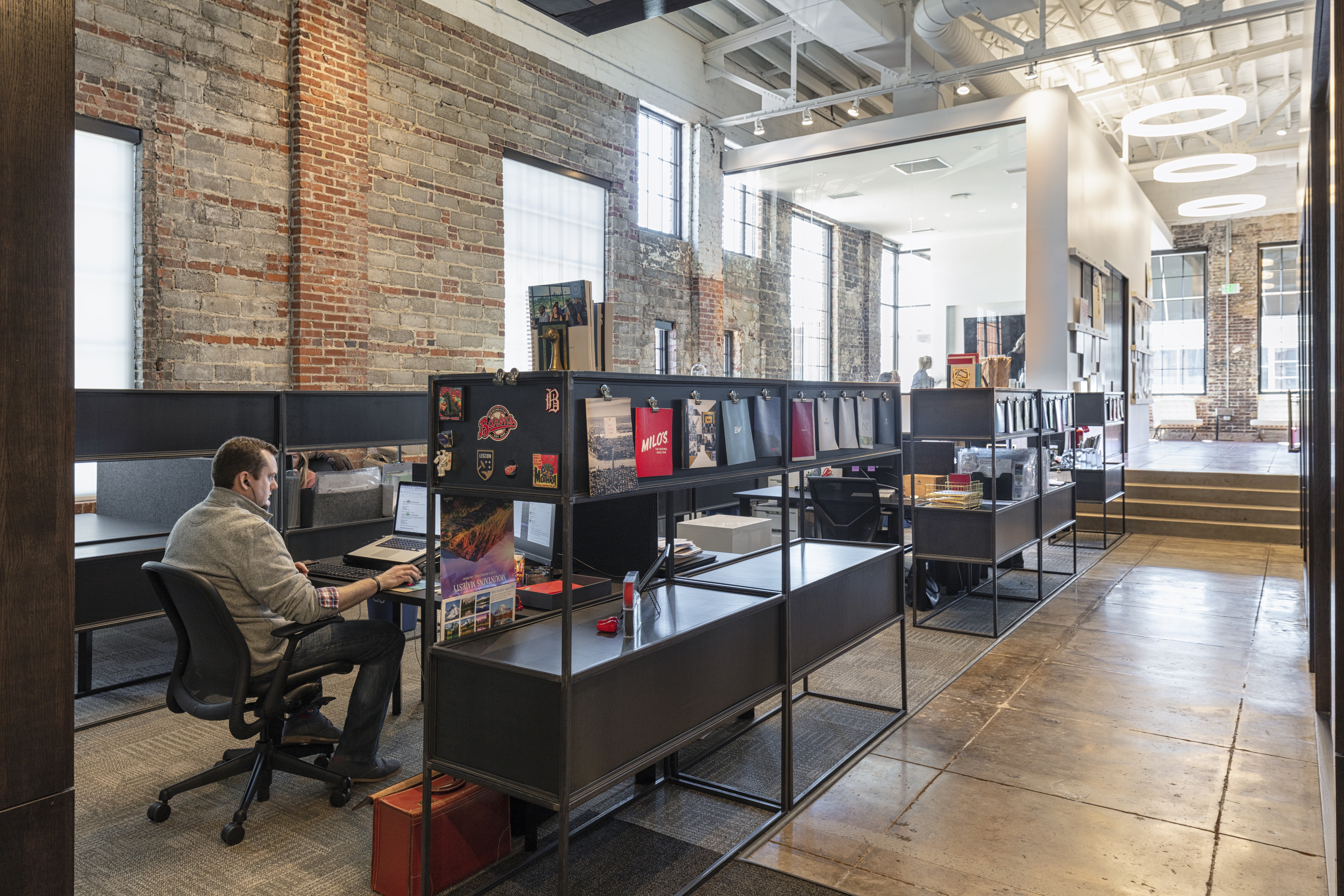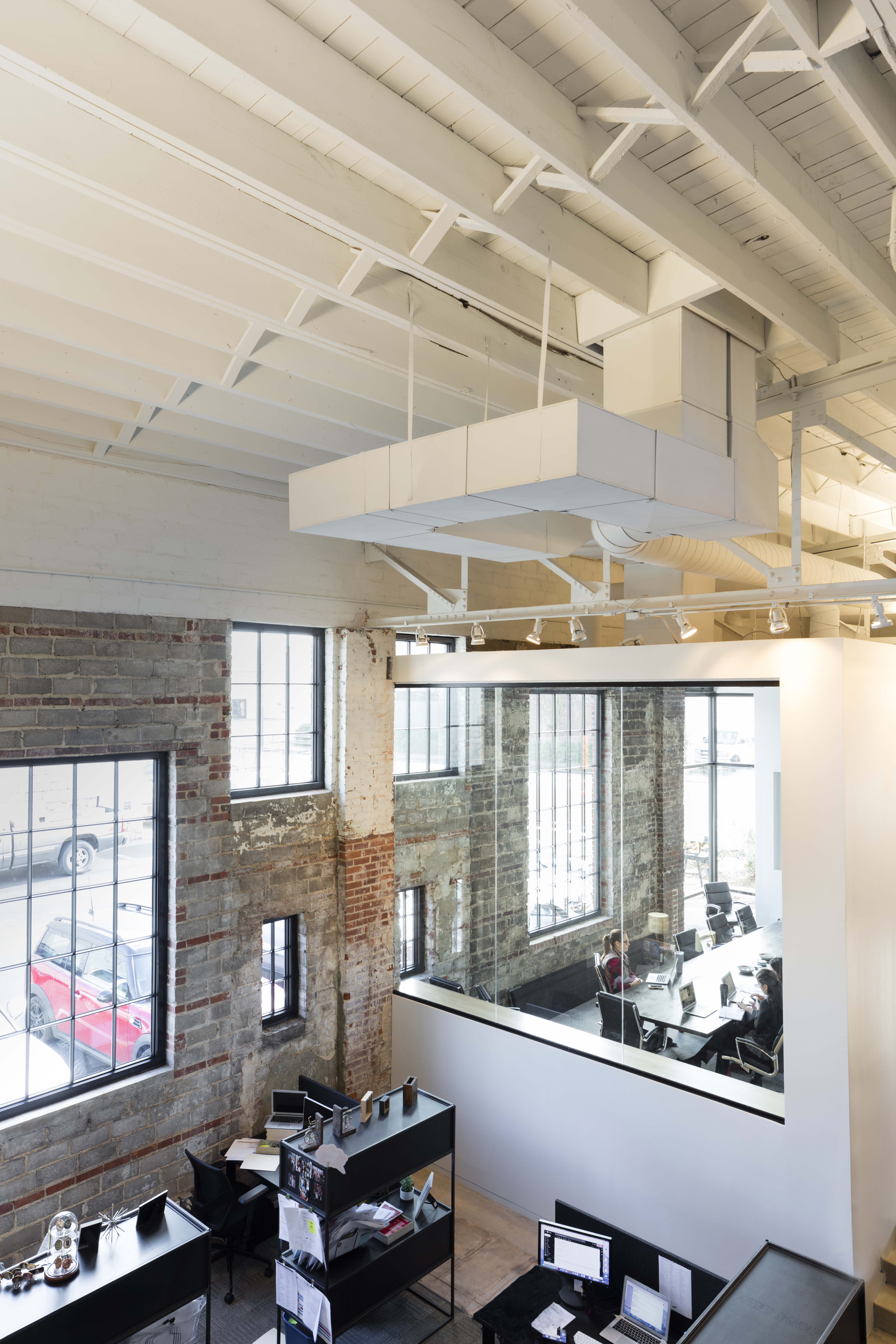 A flourishing creative branding agency located in downtown Birmingham, AL found themselves rapidly outgrowing their existing office space, so they sought a new home in a former service garage warehouse that could meet the diverse and conflicting needs of their core operational departments. Following a deep dive into the agency’s office culture and future needs, the design team developed a solution that creates nodes of space tailored to each department’s needs while encouraging engagement and collaboration where the nodes intersect.