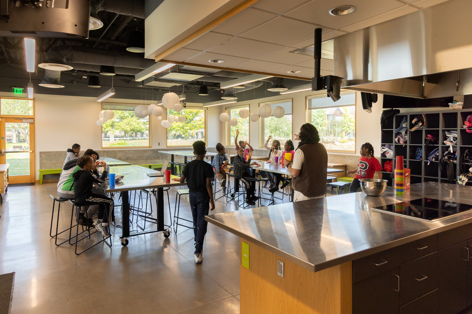 Simple volumes clad in steel panels are punctured with large expanses of windows admitting natural light deep into the spaces. The culinary studio is designed as a teaching kitchen with full video capability for remote and recorded instruction. Through the large windows, the Studio has sweeping views of the crop rows. This visual connection reinforces the teaching that occurs at the adjustable height prep stations.