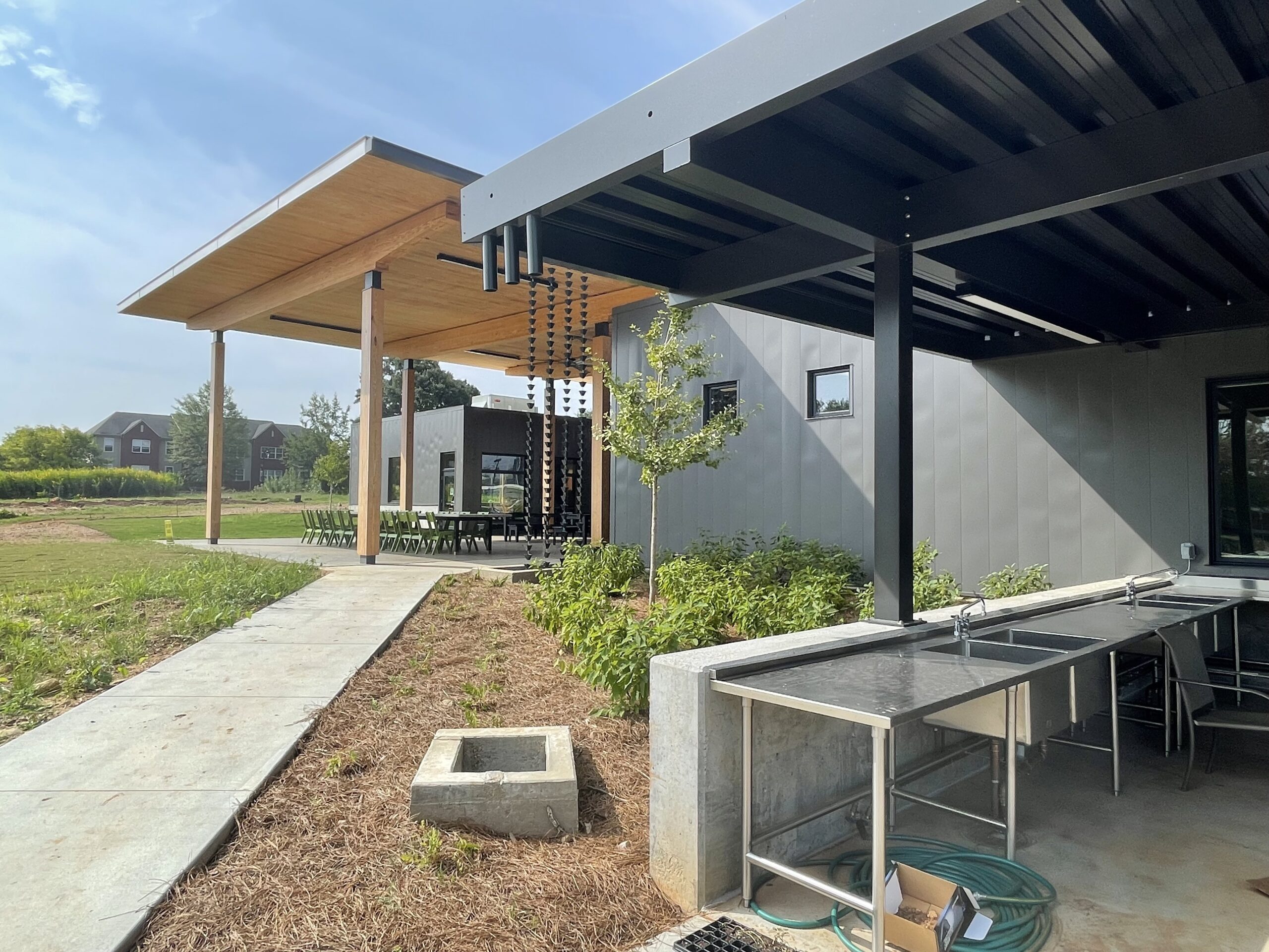At the southwest corner of the site, a community garden with a neighborhood entrance gate connects the Center with the neighborhood. A farmstand located amongst the community garden sells fresh produce and flowers to the public.