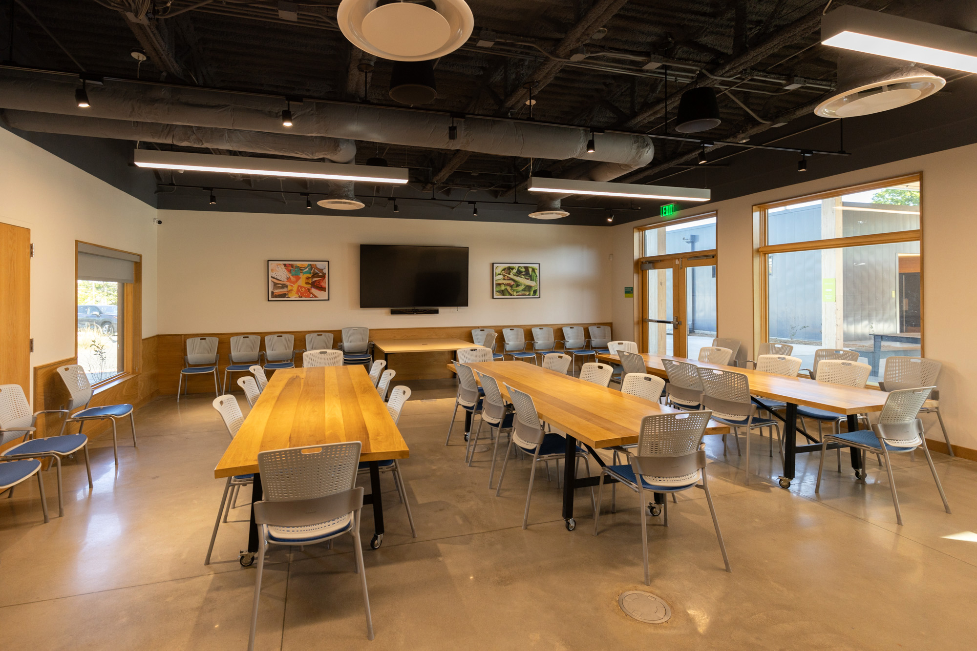 Simple volumes clad in steel panels are punctured with large expanses of windows admitting natural light deep into the spaces. The culinary studio is designed as a teaching kitchen with full video capability for remote and recorded instruction. Through the large windows, the Studio has sweeping views of the crop rows. This visual connection reinforces the teaching that occurs at the adjustable height prep stations.