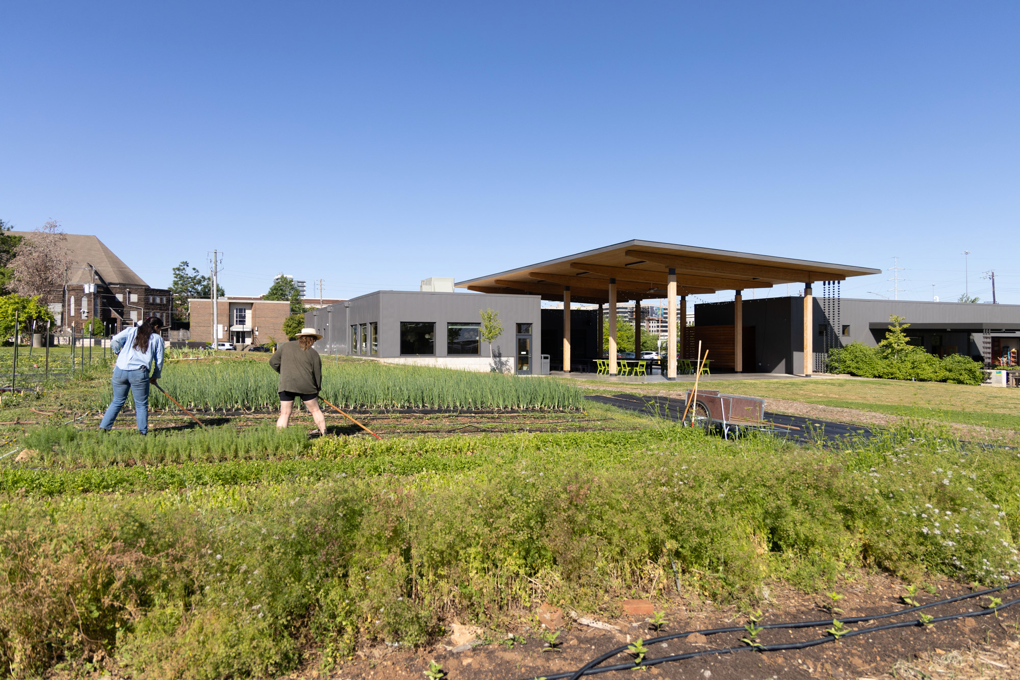Jones Valley Teaching Farm’s Center for Food Education serves as the headquarters for the non-profit’s seed-to-plate educational mission throughout the Birmingham City Schools system. The Center is located on single square block in downtown Birmingham. The buildings are sited within one quadrant at the northwest corner, leaving the remaining three southern-facing quadrants for farming and community outreach raised beds.