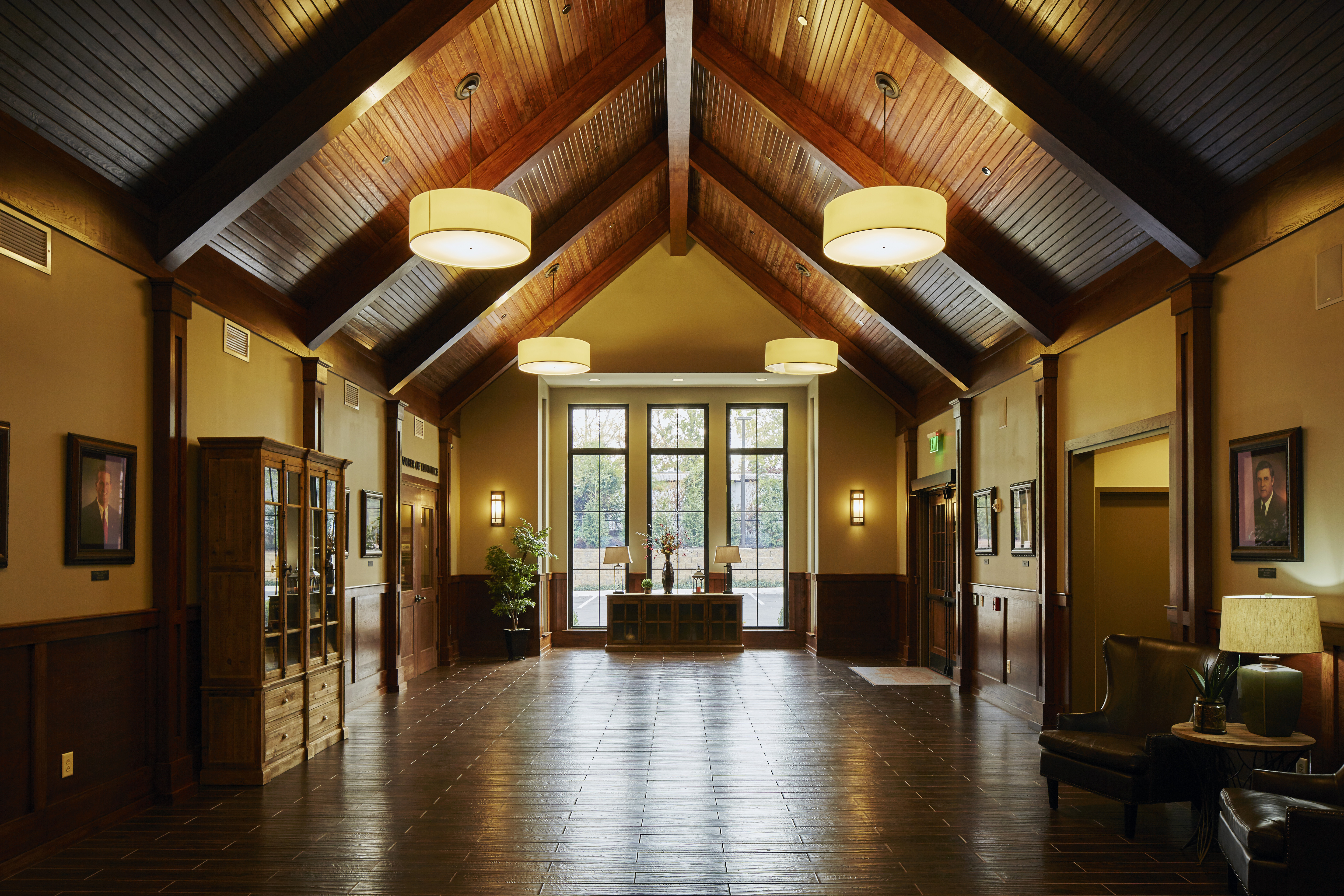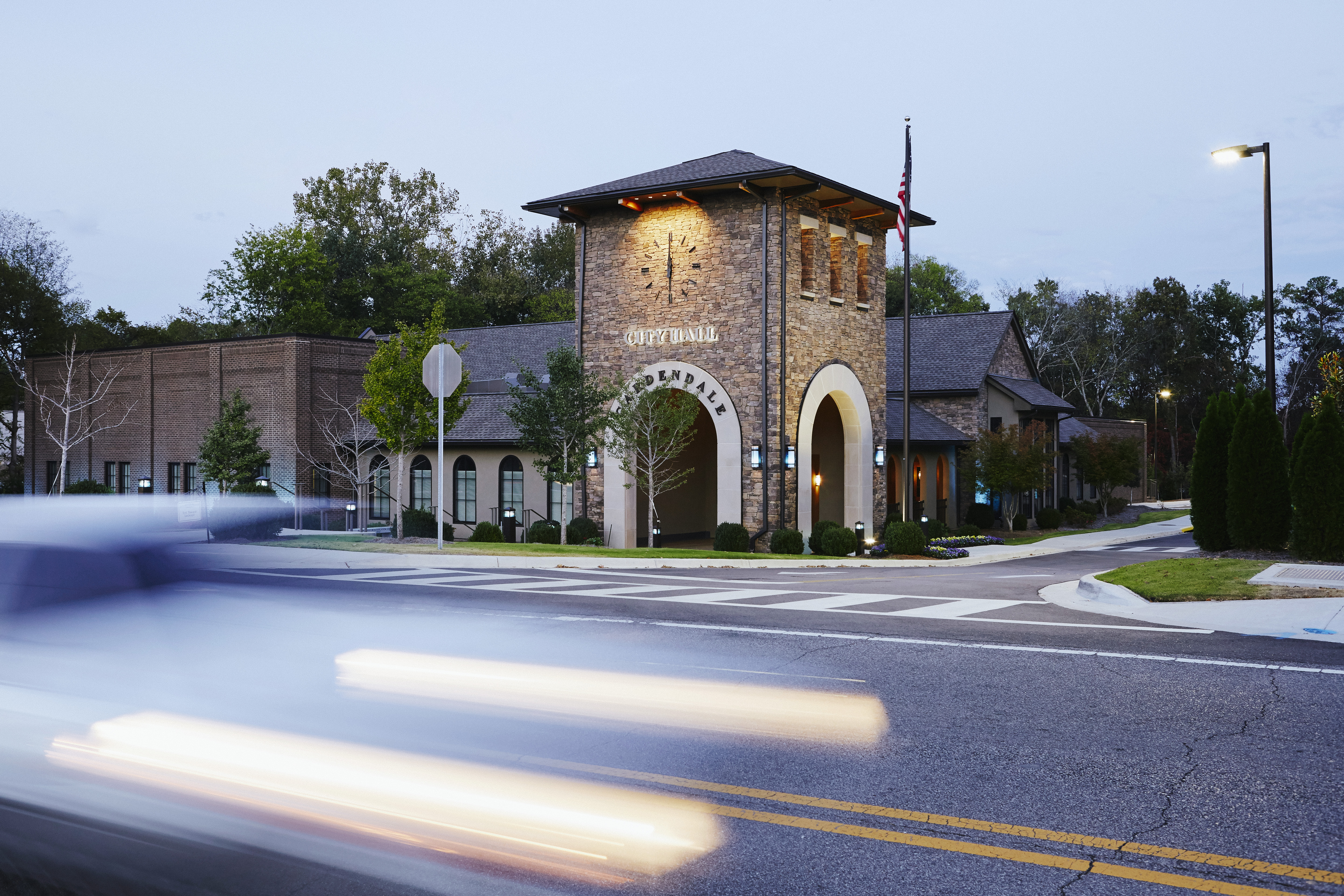 After working for some time in an assortment of temporary facilities, the City of Gardendale, AL approached ArchitectureWorks about designing a one-stop shop for all the services of the Administration, Inspection, and Chamber of Commerce departments. Organized like a central spine, the welcome Lobby and Council Chambers are flanked by the Administration and Inspection departments to the left and right. Traditional materials such as brick, stone, and stucco clad the exterior, and the interior is characterized by highly-crafted wood millwork, wainscot, and ceiling details. Mature trees line an existing creek along the back of the site, and every office takes in a view to the exterior.