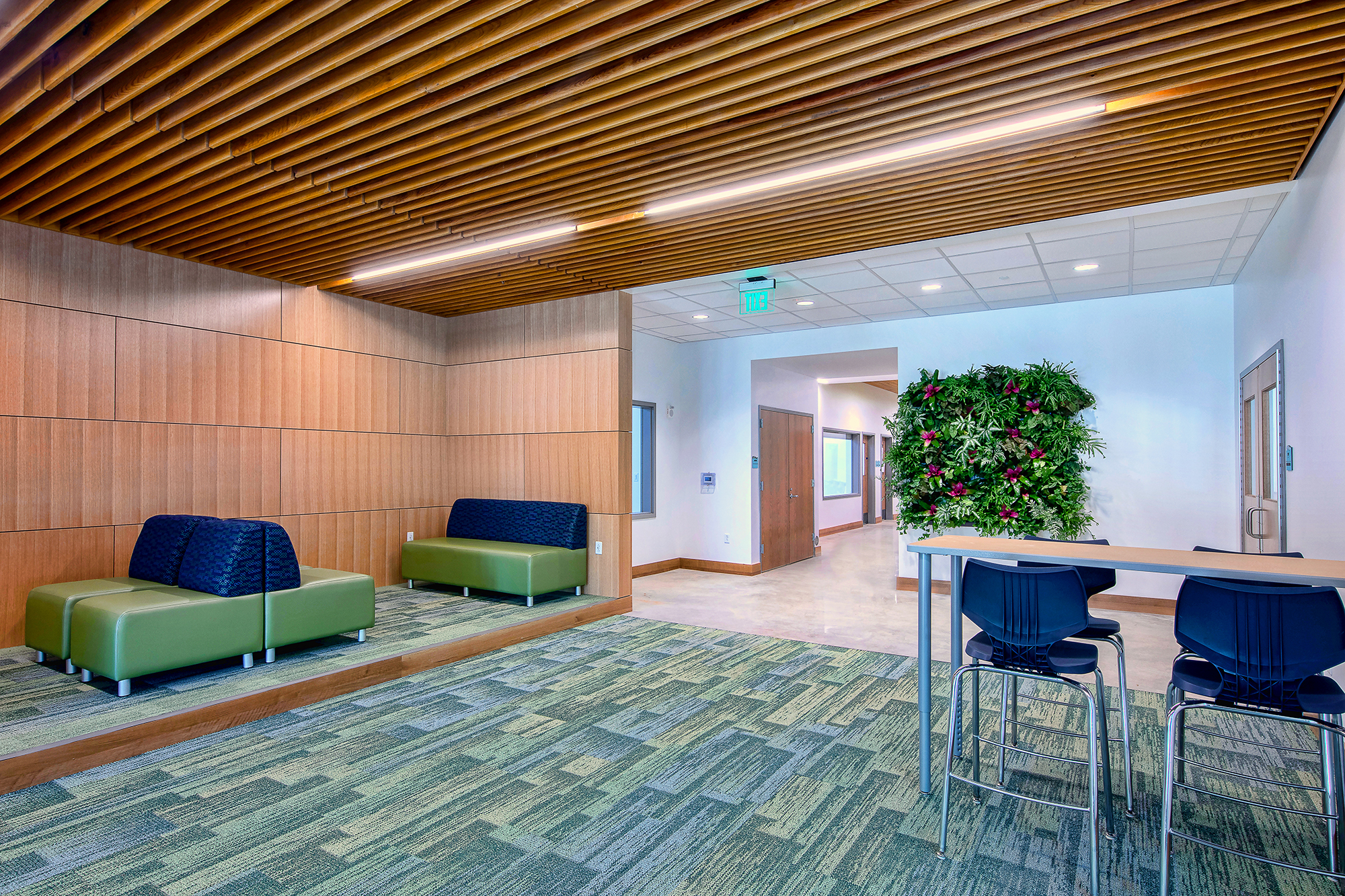 The first phase of the masterplan is a Student Life Center comprising a Gymnasium, a lunchroom with commercial cooking kitchen, four new classrooms and support spaces, a storm shelter and informal student gathering spaces. The overall vision was to provide a space on the campus focused on the wellbeing of the students, where fitness, nutrition, and education can coexist. The new building opens to the rest of the campus through a series of large porches, with some of the porches facing the quad while others open to a rocky outcrop that defines the edge of campus, creating outdoor classroom spaces.