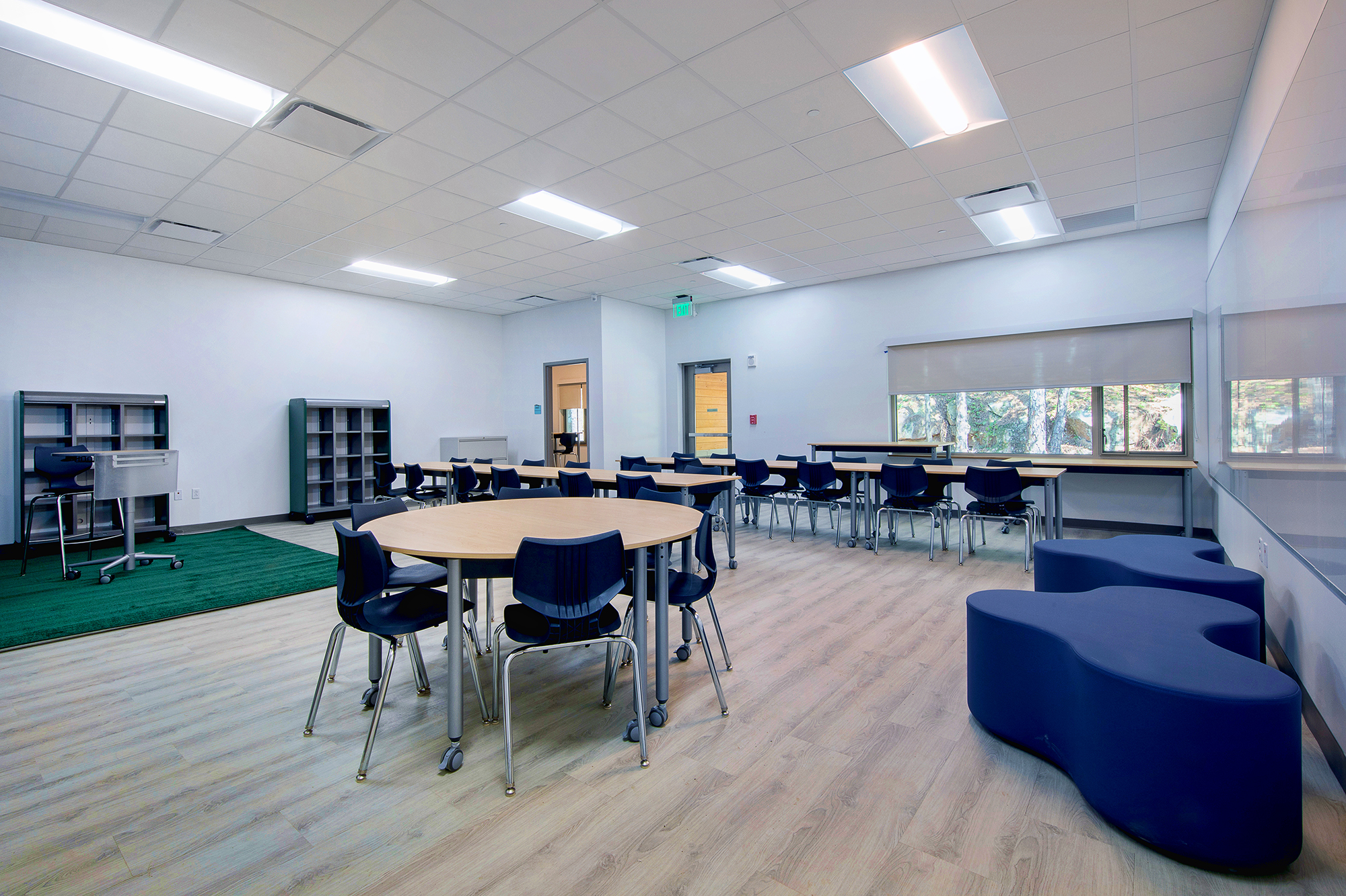 The first phase of the masterplan is a Student Life Center comprising a Gymnasium, a lunchroom with commercial cooking kitchen, four new classrooms and support spaces, a storm shelter and informal student gathering spaces. The overall vision was to provide a space on the campus focused on the wellbeing of the students, where fitness, nutrition, and education can coexist. The new building opens to the rest of the campus through a series of large porches, with some of the porches facing the quad while others open to a rocky outcrop that defines the edge of campus, creating outdoor classroom spaces.
