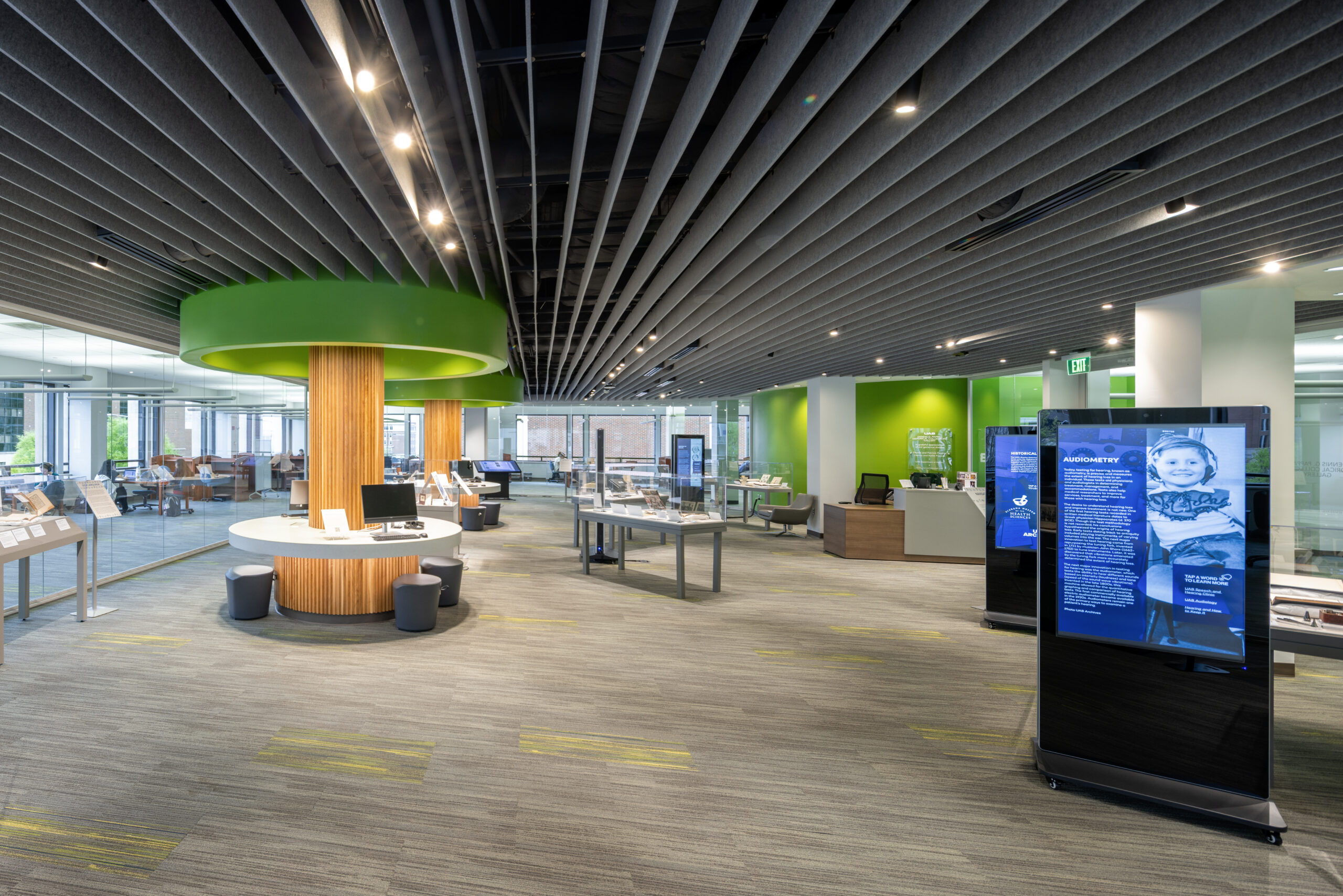 The Dennis G. Pappas Historical Collections Gallery at the University of Alabama at Birmingham’s Lister Hill Library of Health and Sciences was conceived to reinvigorate a previously underused interior area. Encompassing approximately 3,000 square feet, the gallery introduces a unique oval layout, set within the strict grid of the existing building. It showcases UAB Libraries’ invaluable historical collections.