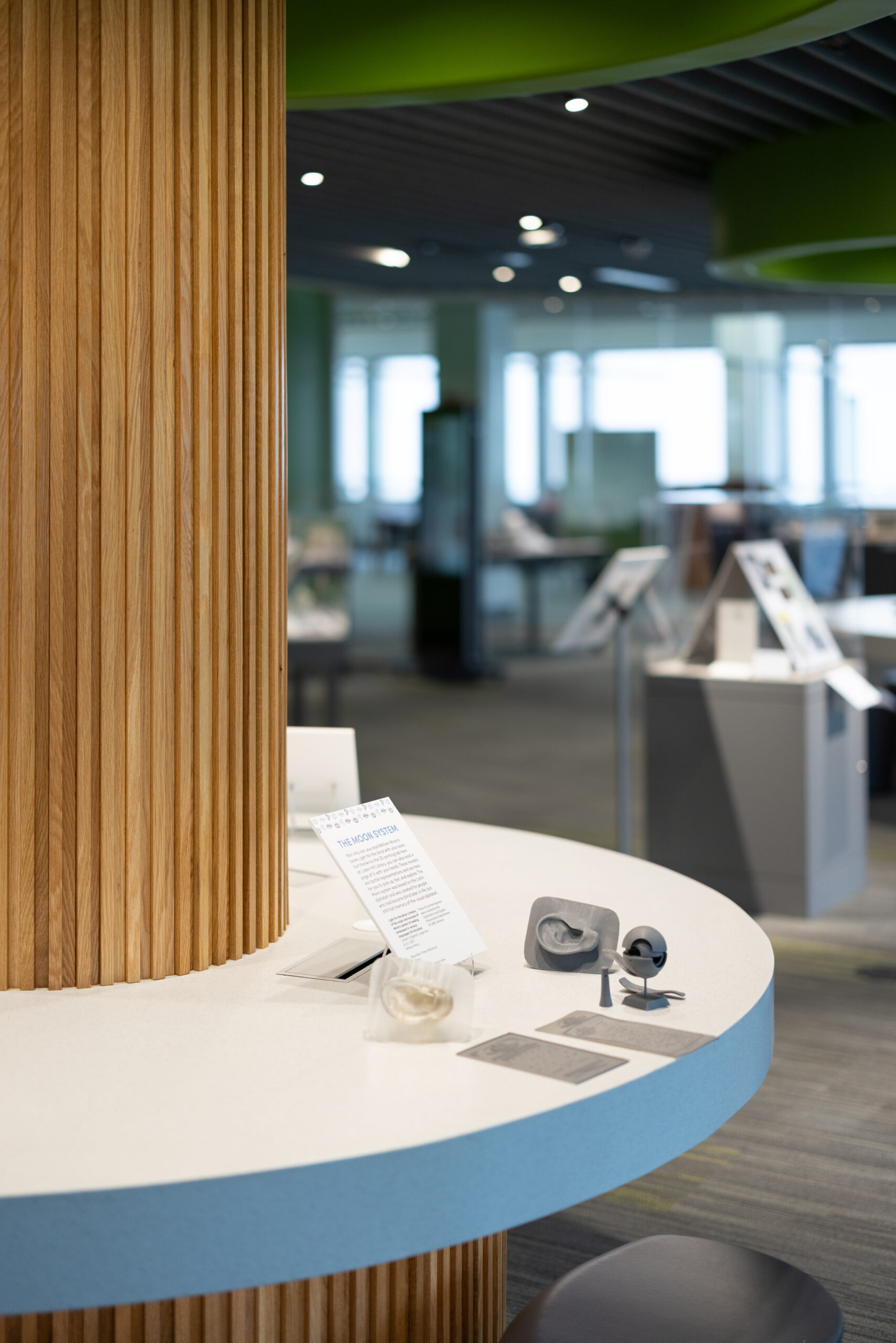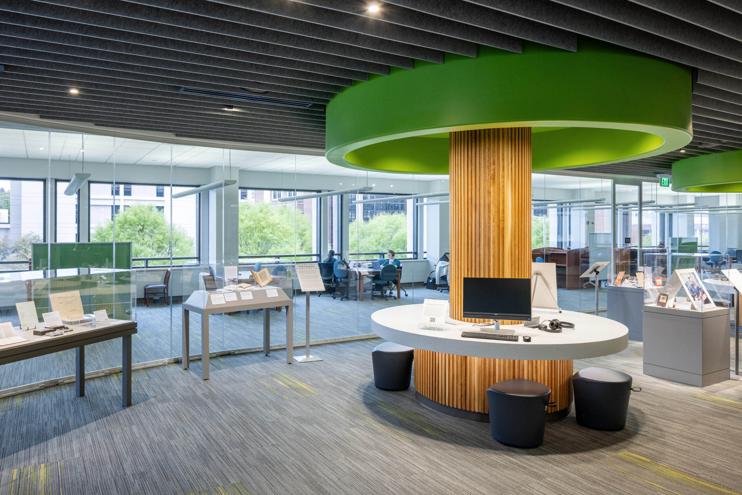 With floor-to-ceiling glass panels, the gallery is visible from all sides, creating an open and inviting atmosphere. Two existing building columns within the space were transformed into interactive display centers. These columns, wrapped in wood tambour and topped with floating green canopies, serve as “learning trees,” symbolizing knowledge and providing visual anchors in the gallery. Above the gallery, linear felt baffles are suspended, with integrated lighting and linear slot vents distributed between them. This design not only enhances the aesthetic appeal but also improves the acoustics and lighting conditions of the space.