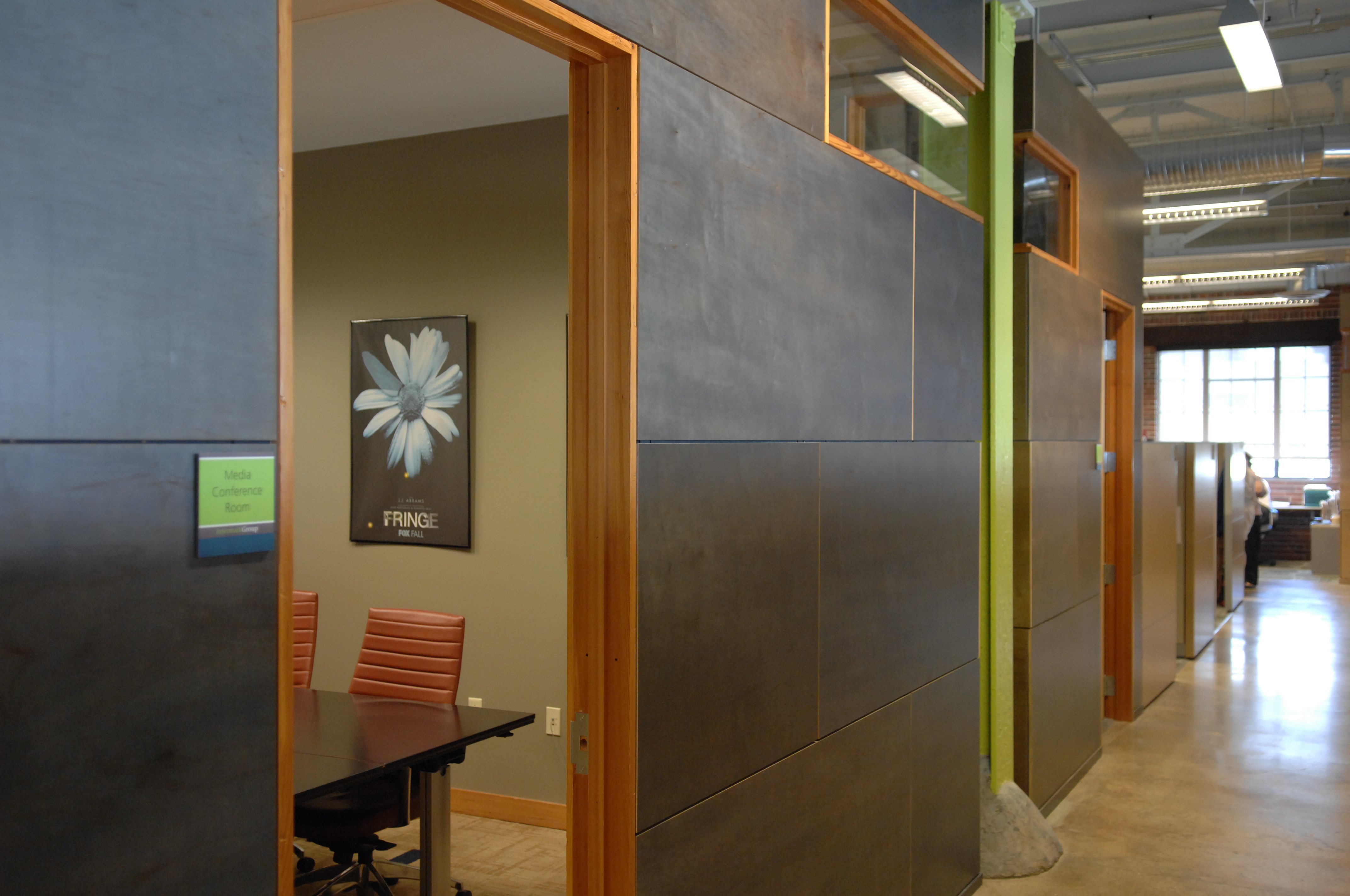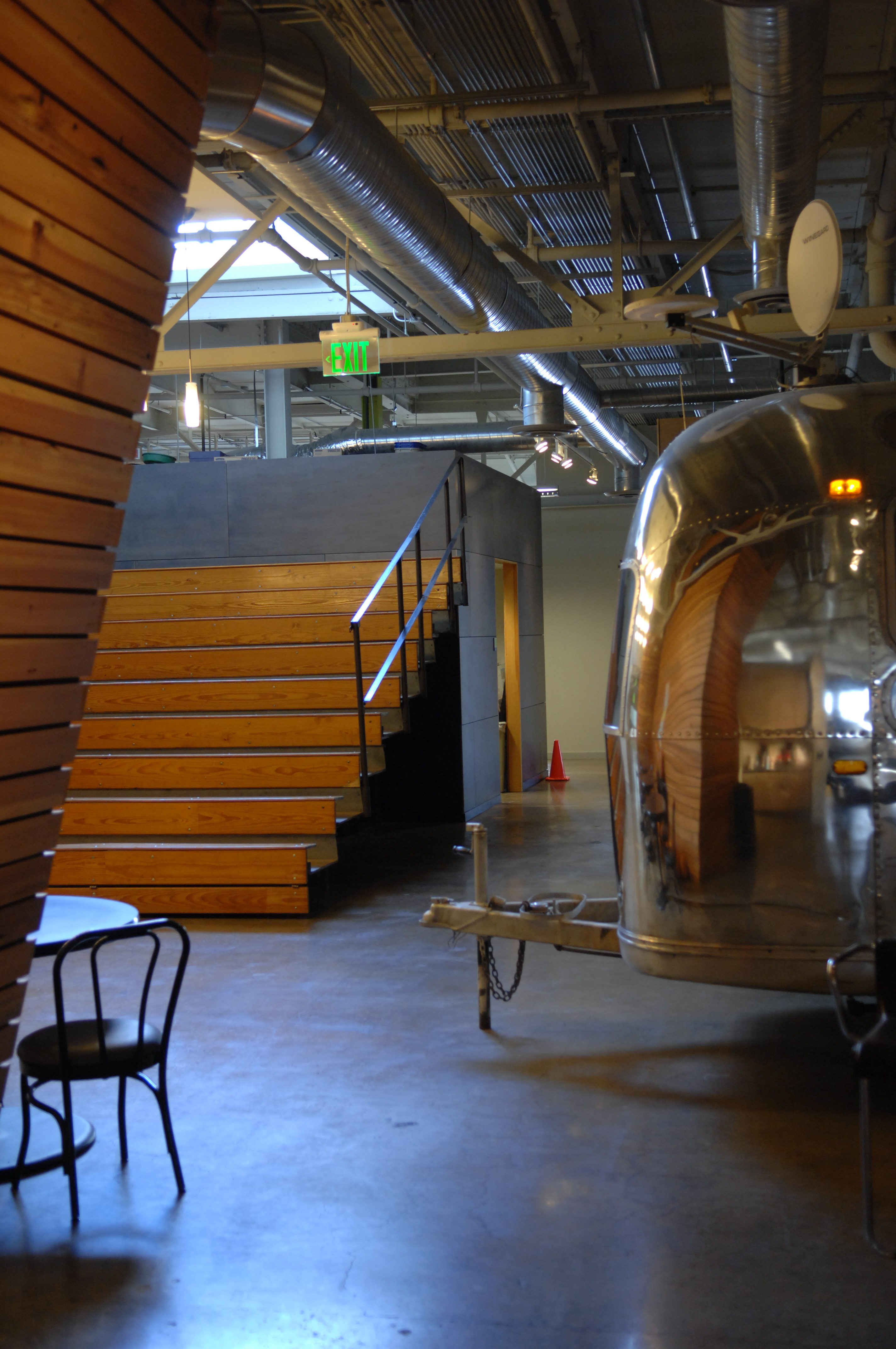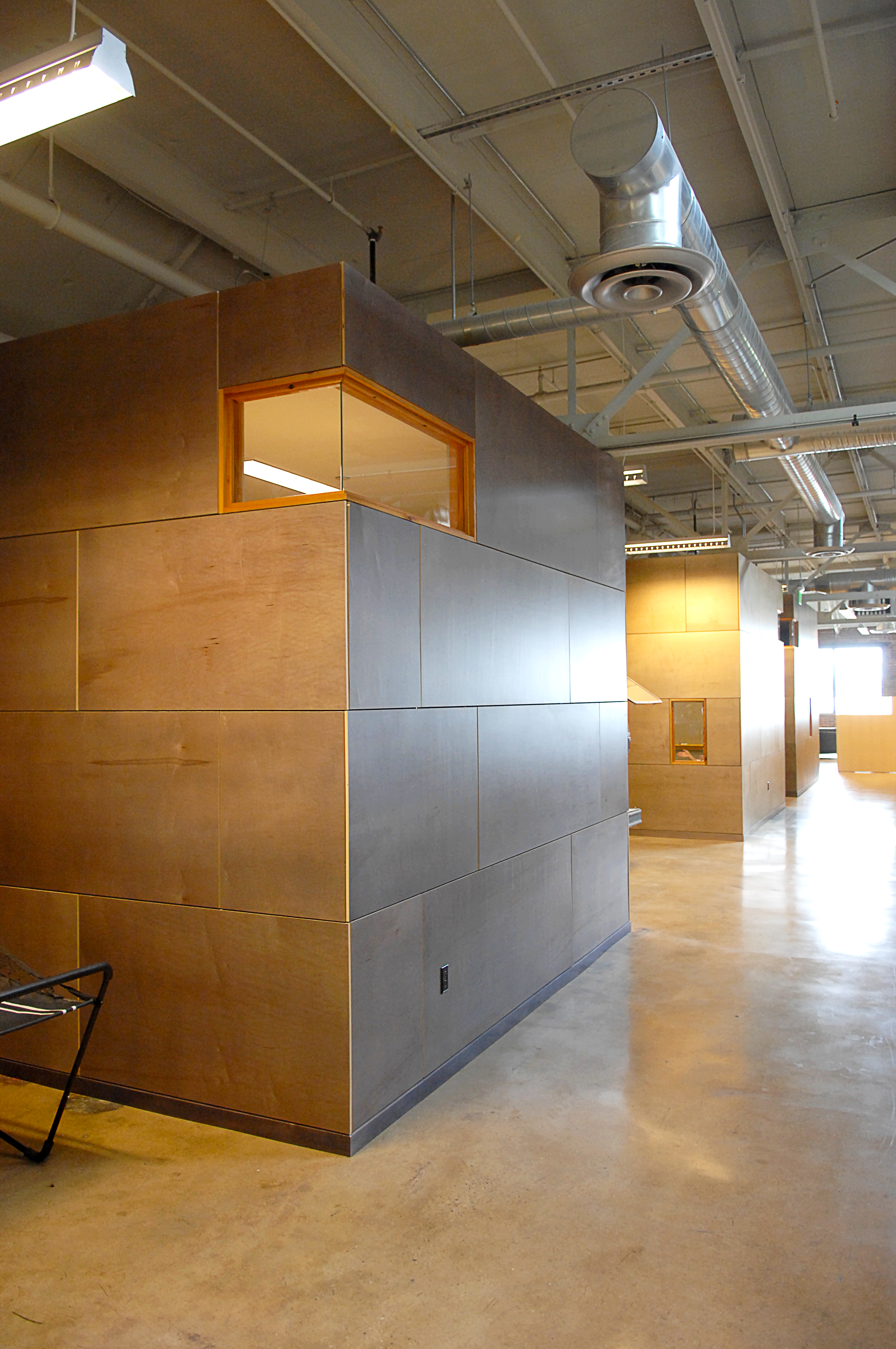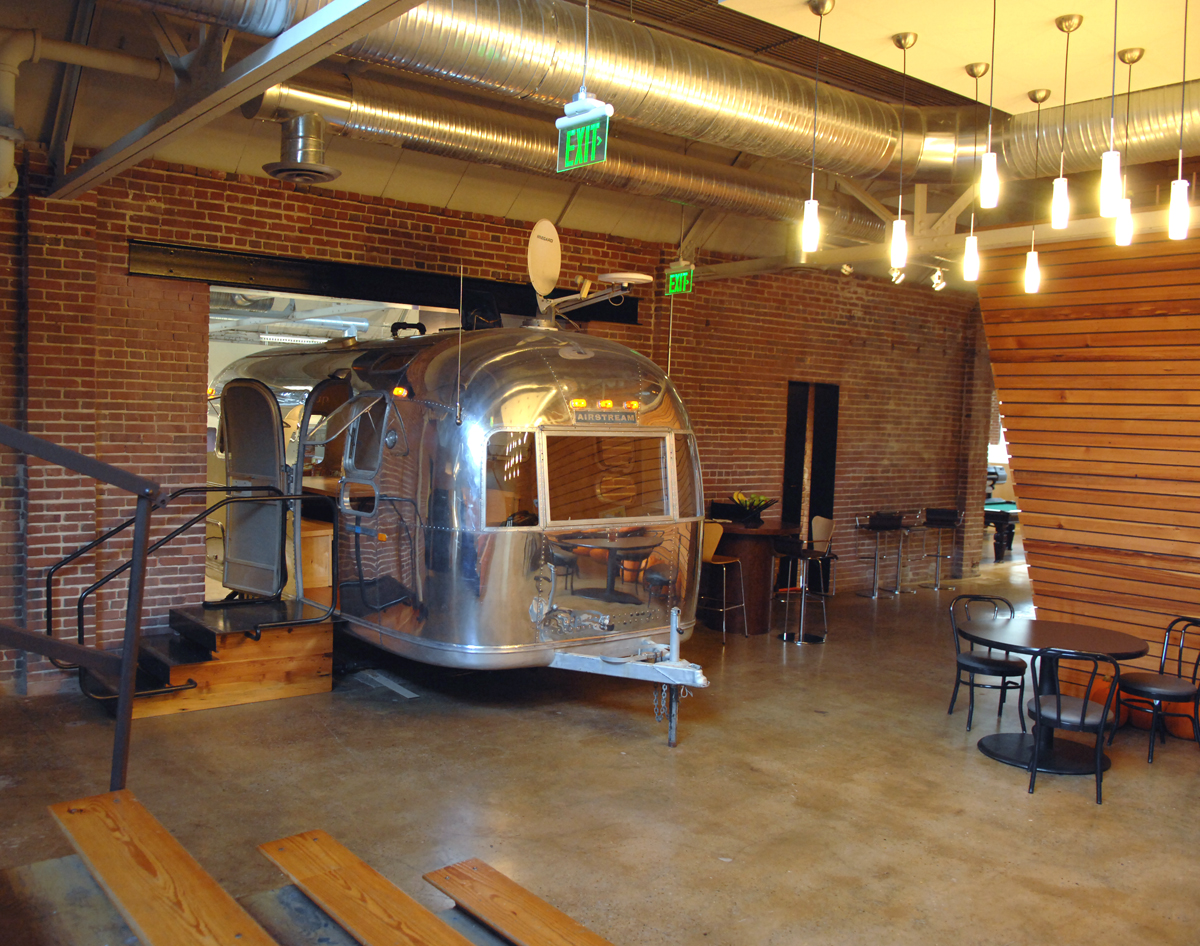 The first floor lobby space was enlarged and refined using colored concrete and wood panels. The second floor was organized around an existing central service core. Conference rooms, clad with dyed plywood panels, wrap this core, pushing the workstations to the perimeter and allowing natural light deep into the building. Smaller “ThinkPods” are anchored along a 24 inch thick brick wall and entered through cut openings in the wall. Over the kitchen, in one of the massive skylights, is another meeting room, a “SkyPod”, wrapped in reclaimed heart pine boards. A salvaged Airstream trailer, converted into a conference room, serves as a focal point for the spaces, and reclaimed elementary school bleachers are used as seating for office-wide gatherings, further enhancing the collaborative environment.