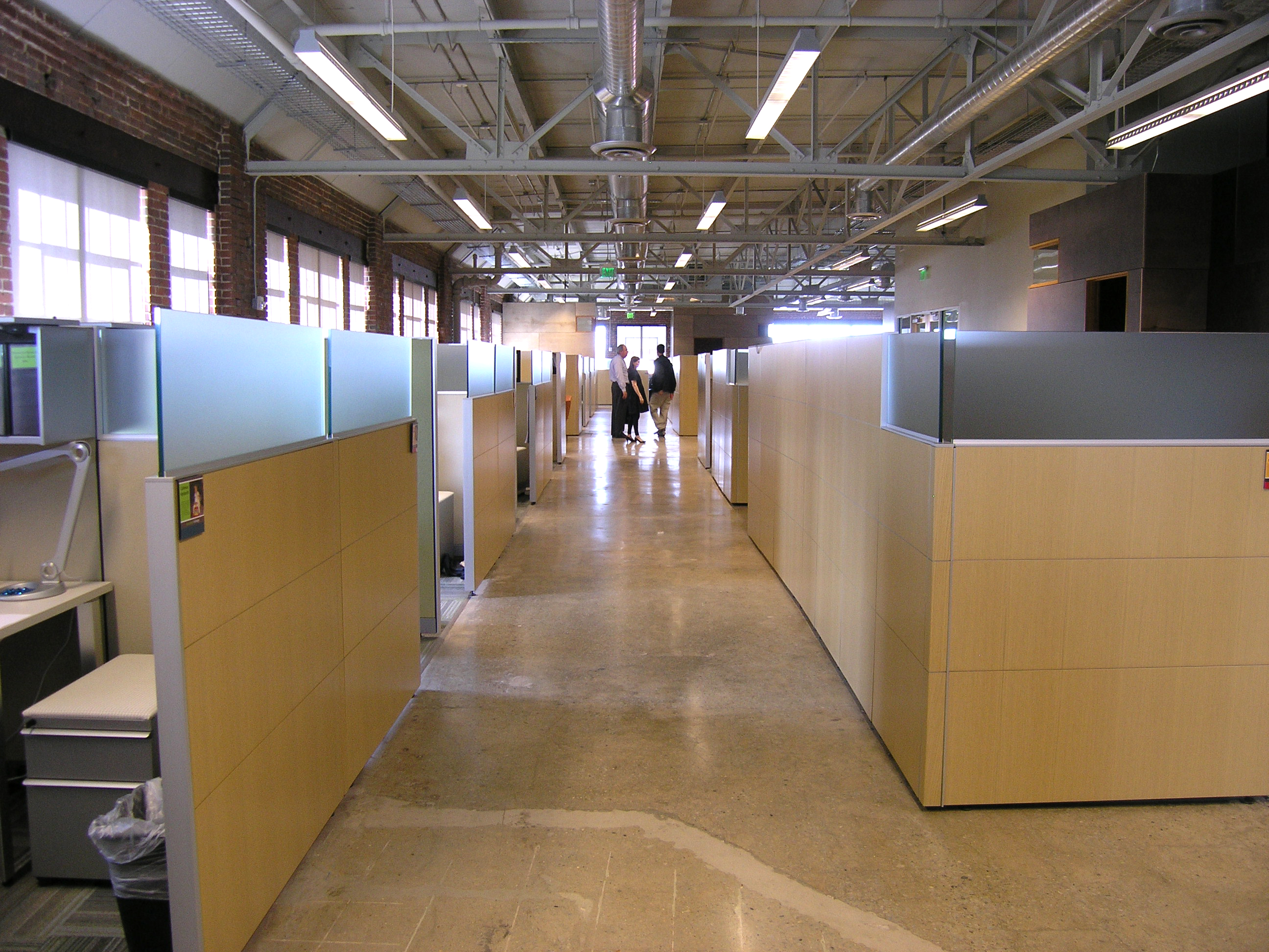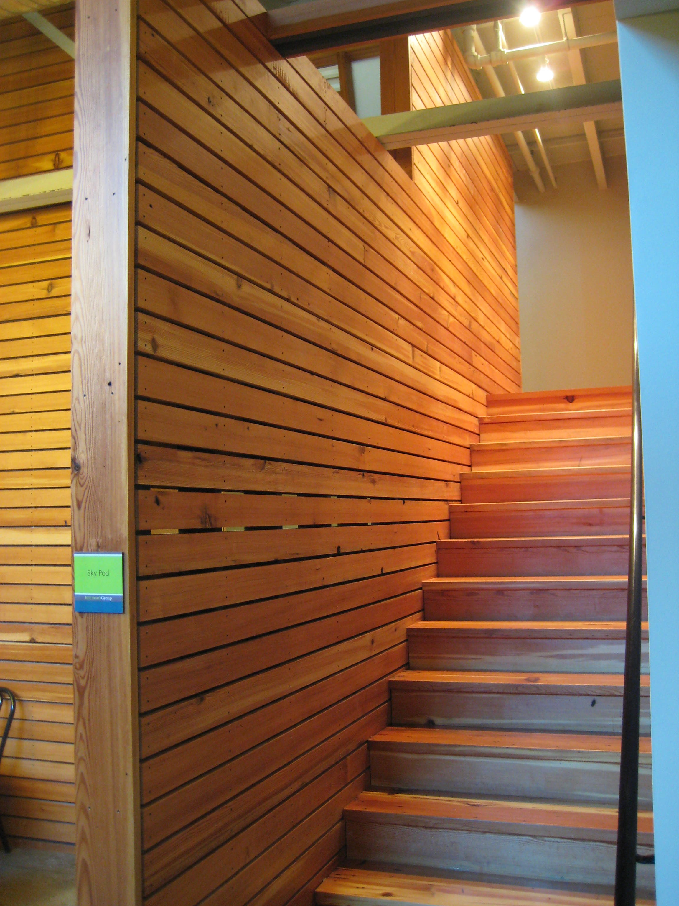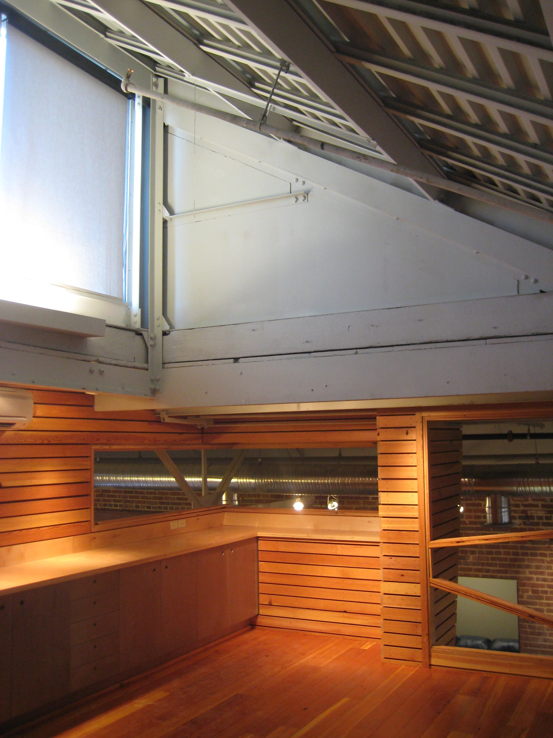 The first floor lobby space was enlarged and refined using colored concrete and wood panels. The second floor was organized around an existing central service core. Conference rooms, clad with dyed plywood panels, wrap this core, pushing the workstations to the perimeter and allowing natural light deep into the building. Smaller “ThinkPods” are anchored along a 24 inch thick brick wall and entered through cut openings in the wall. Over the kitchen, in one of the massive skylights, is another meeting room, a “SkyPod”, wrapped in reclaimed heart pine boards. A salvaged Airstream trailer, converted into a conference room, serves as a focal point for the spaces, and reclaimed elementary school bleachers are used as seating for office-wide gatherings, further enhancing the collaborative environment.
