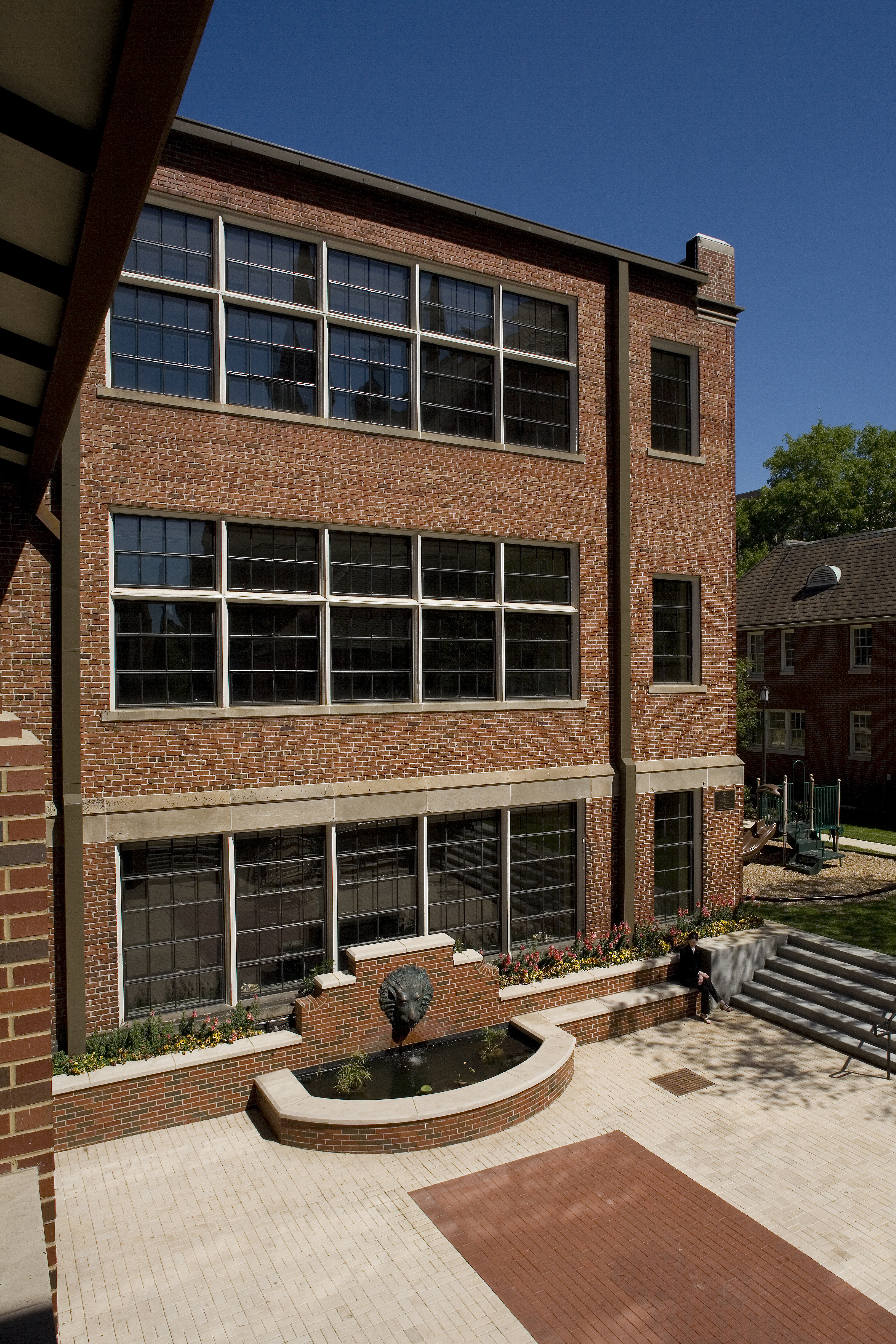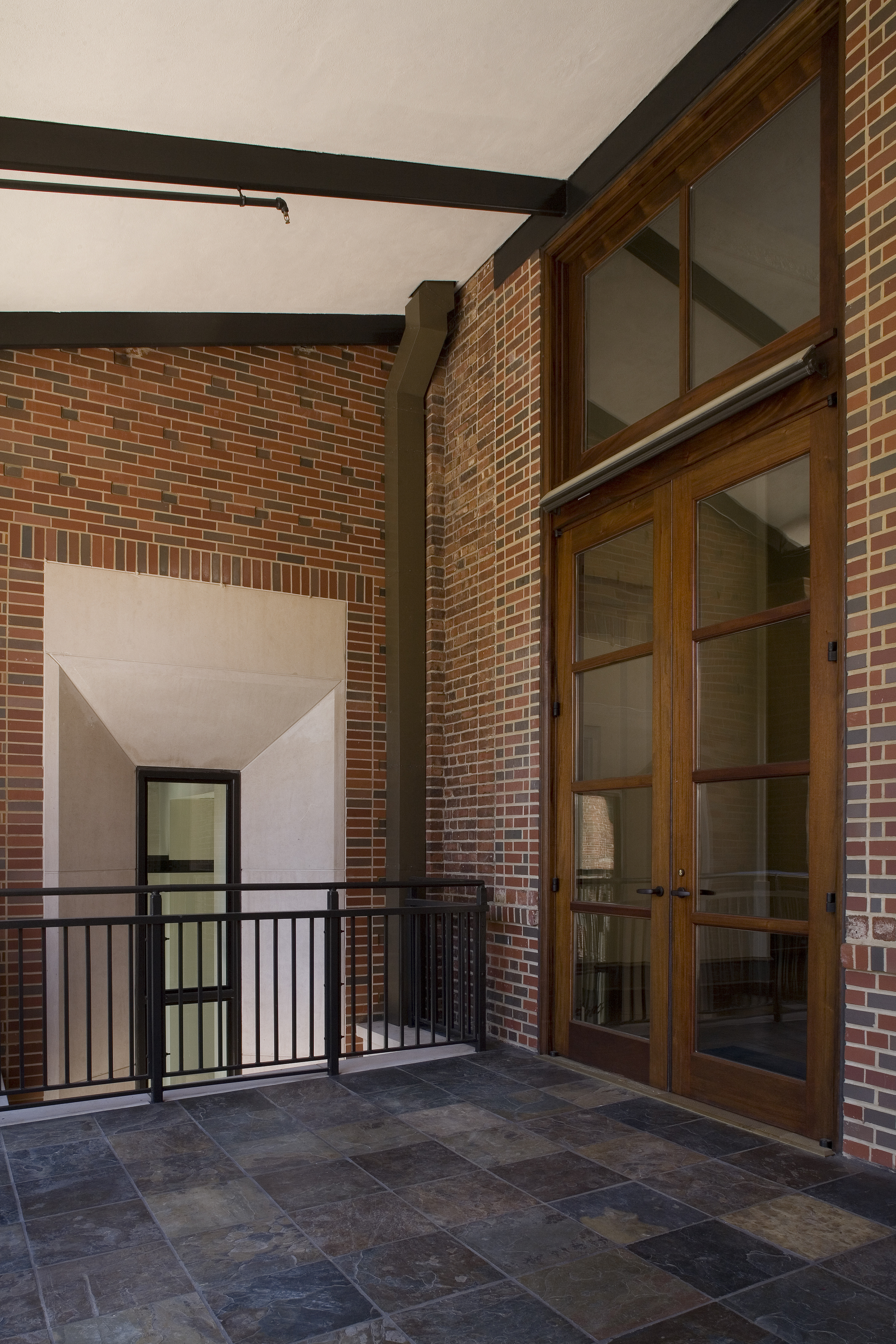 The interior of the existing school building was fully renovated. An elevator and exit stairs were added to bring the building up to code. In addition all classrooms, offices, kitchen and restrooms were fully renovated. New heating and air were also integrated with the spaces of the existing building. A new bell tower anchors the renovated school building and provides a focal point for the interior of the campus. The materials, detailing, and scale are intended to blend seamlessly with the aesthetic of the existing structures. A new porch and colonnade link the interior great hall with the courtyard. This new central courtyard serves as the heart of the campus while the renovation of the school building gives a new life to an historic building.