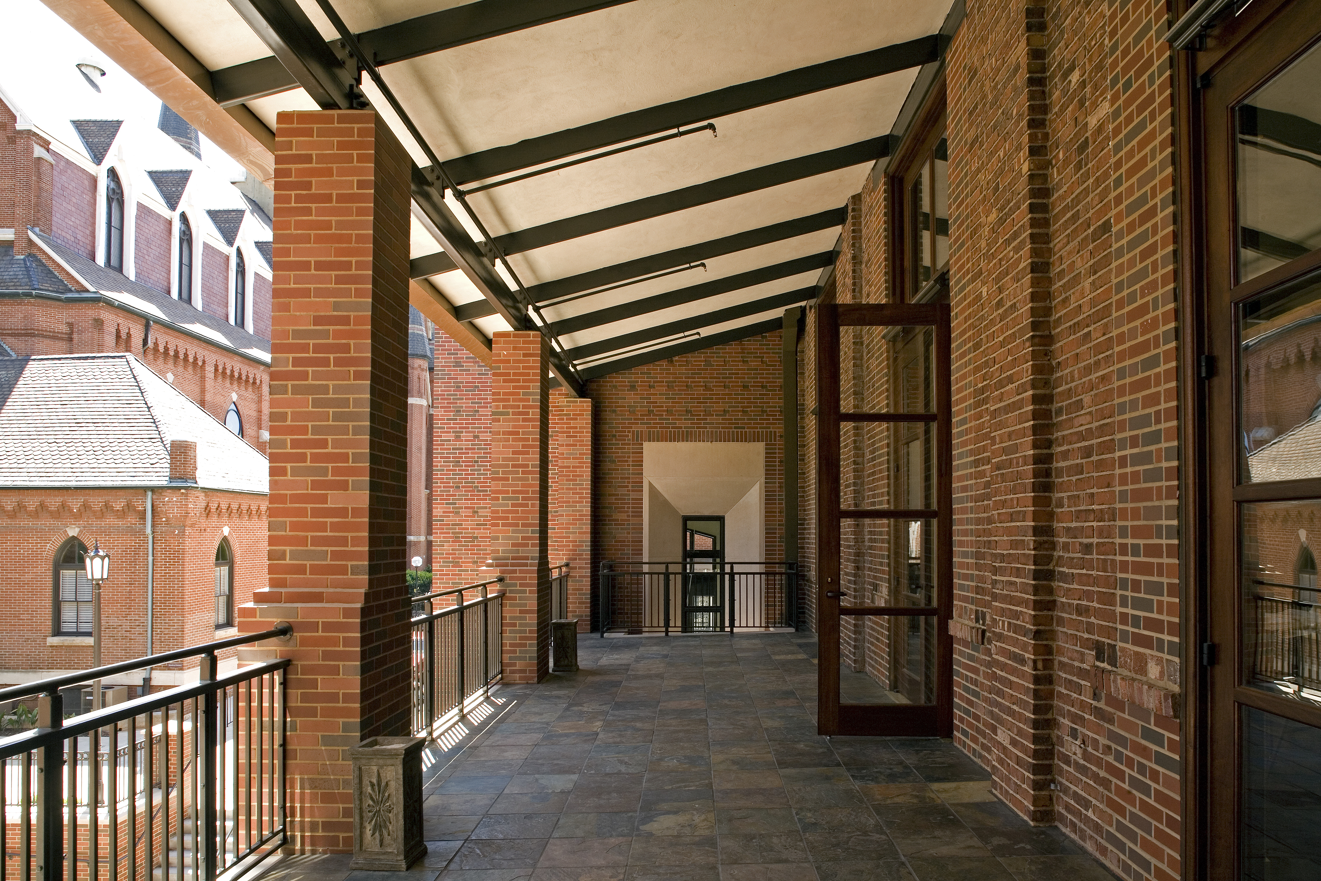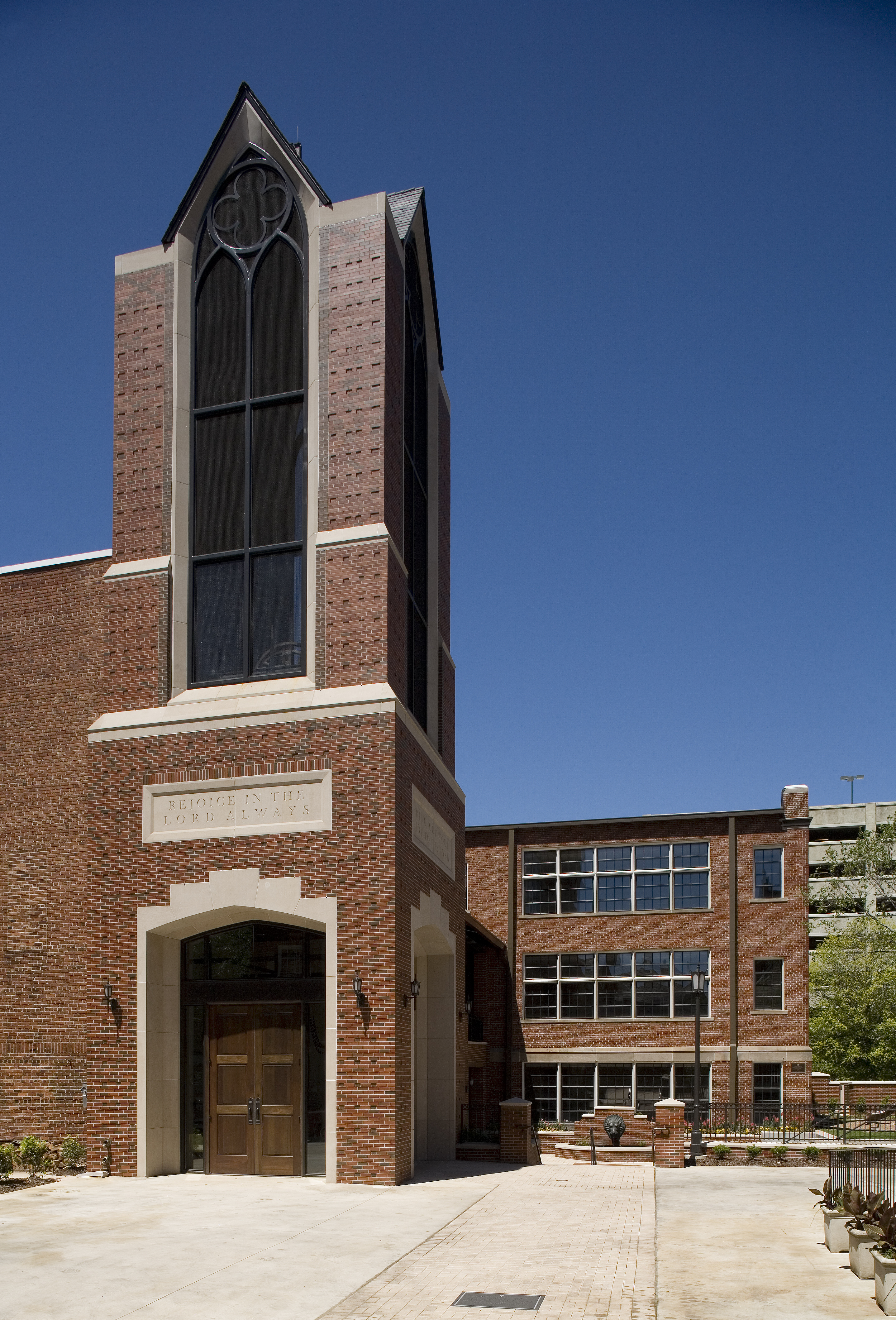 St. Paul’s Cathedral, located in the heart of downtown Birmingham, called on ArchitectureWorks to renovate an existing 1920’s school building adjacent to the cathedral as well as re-envision the space which connects the Cathedral, the Parrish Offices, the School and the Rectory. The space between the buildings, existing as a parking lot, was re-envisioned as a courtyard that would provide an outdoor connection for the campus. A portion of this outdoor space was lowered to meet at grade with the first level of the school building creating an outdoor gathering and overflow space for the large banquet room.