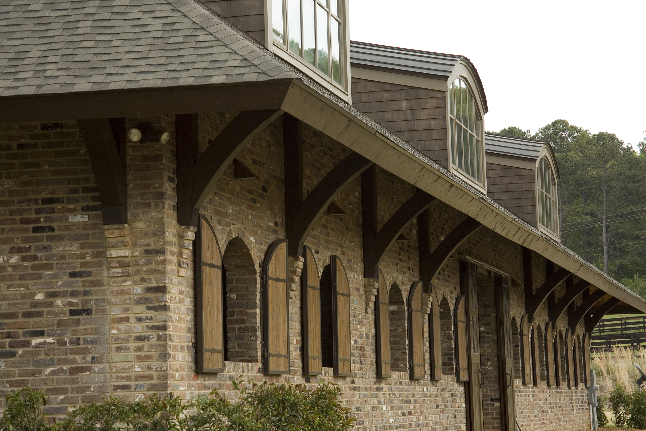 The owners of this residence wanted to have a connected house and barn. Surrounded by horse pastures, the barn-residence looks out over a hunter-jumper arena. The main level of the project is a barn with wash-rack, tack-room, feed-room and eight stalls. A large cupola and clerestory dormer windows flood the wide barn aisle with natural light. On the upper level a three bedroom residence has views out to the surrounding pastures and riding arena. A large porch at the main level provides outdoor living space and a viewing stand for the arena.
