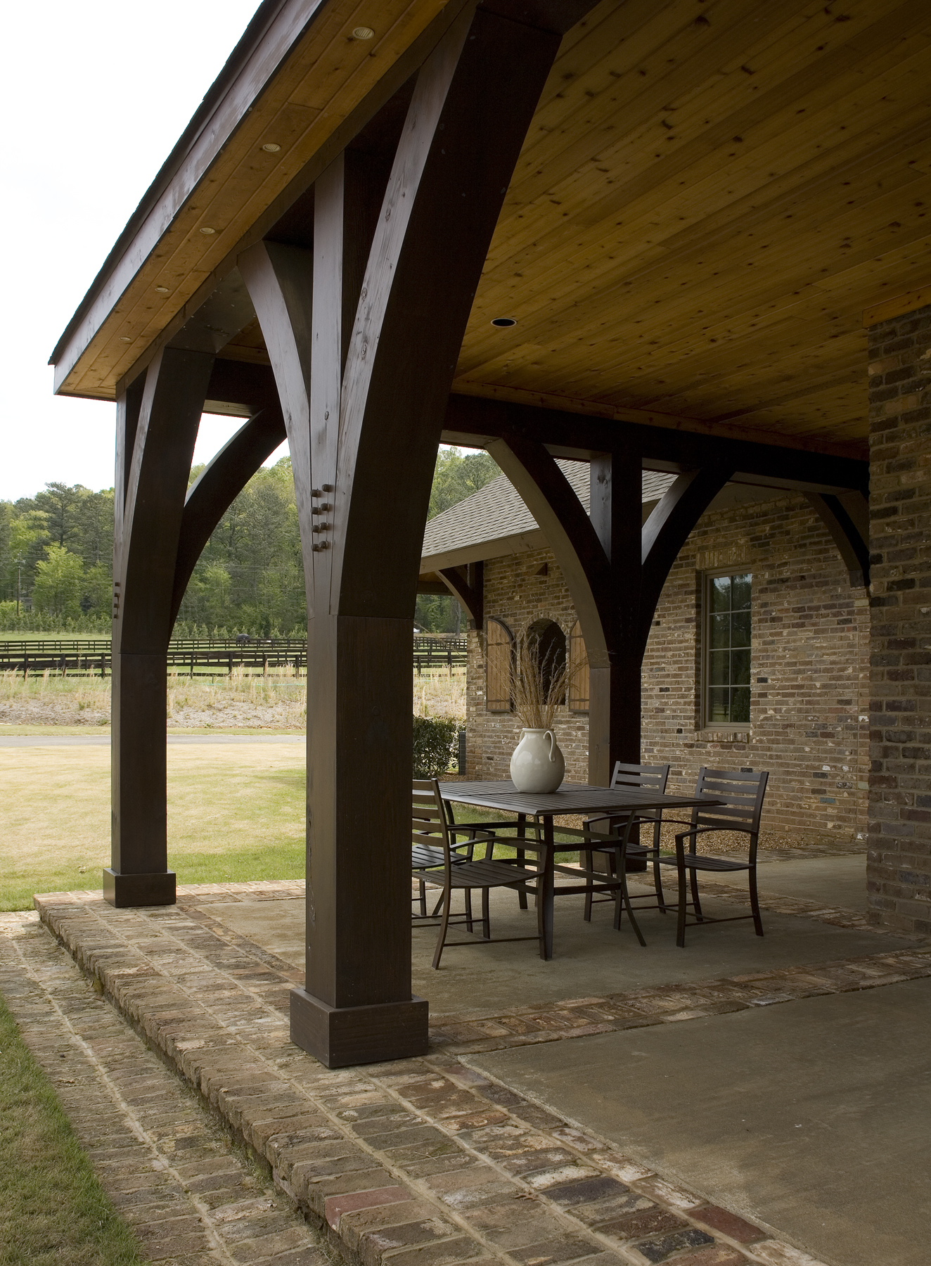 A heavy timber structure combined with reclaimed brick and cedar shingles wrap the exterior while tongue and groove decking skin the ceilings inside the barn. Tractors and farm equipment are housed in a separate shed structure that is clad in wood boards to match the main building.