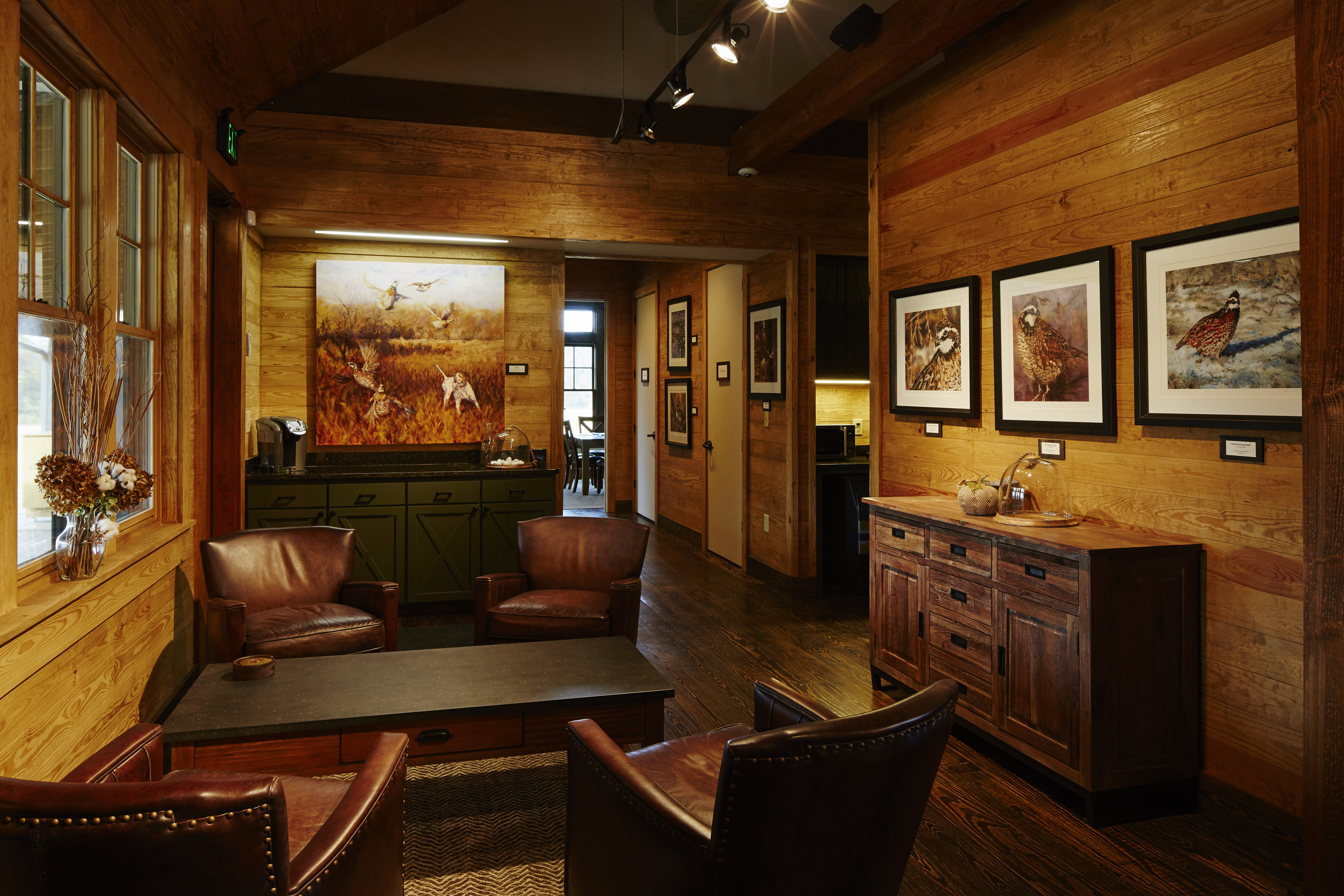 To round out the already award-winning outdoor leisure resort and golf course, Pursell Farms partnered with the Orvis brand to create one of the only premier shooting clubs in the heart of the South. Antebellum homes and agricultural buildings alike dot the rolling hill and split-rail fence landscape; a deep wrap-around porch is the defining characteristic of the new Orvis building, creating a transitional place for waiting, watching, and taking in the idyllic view.