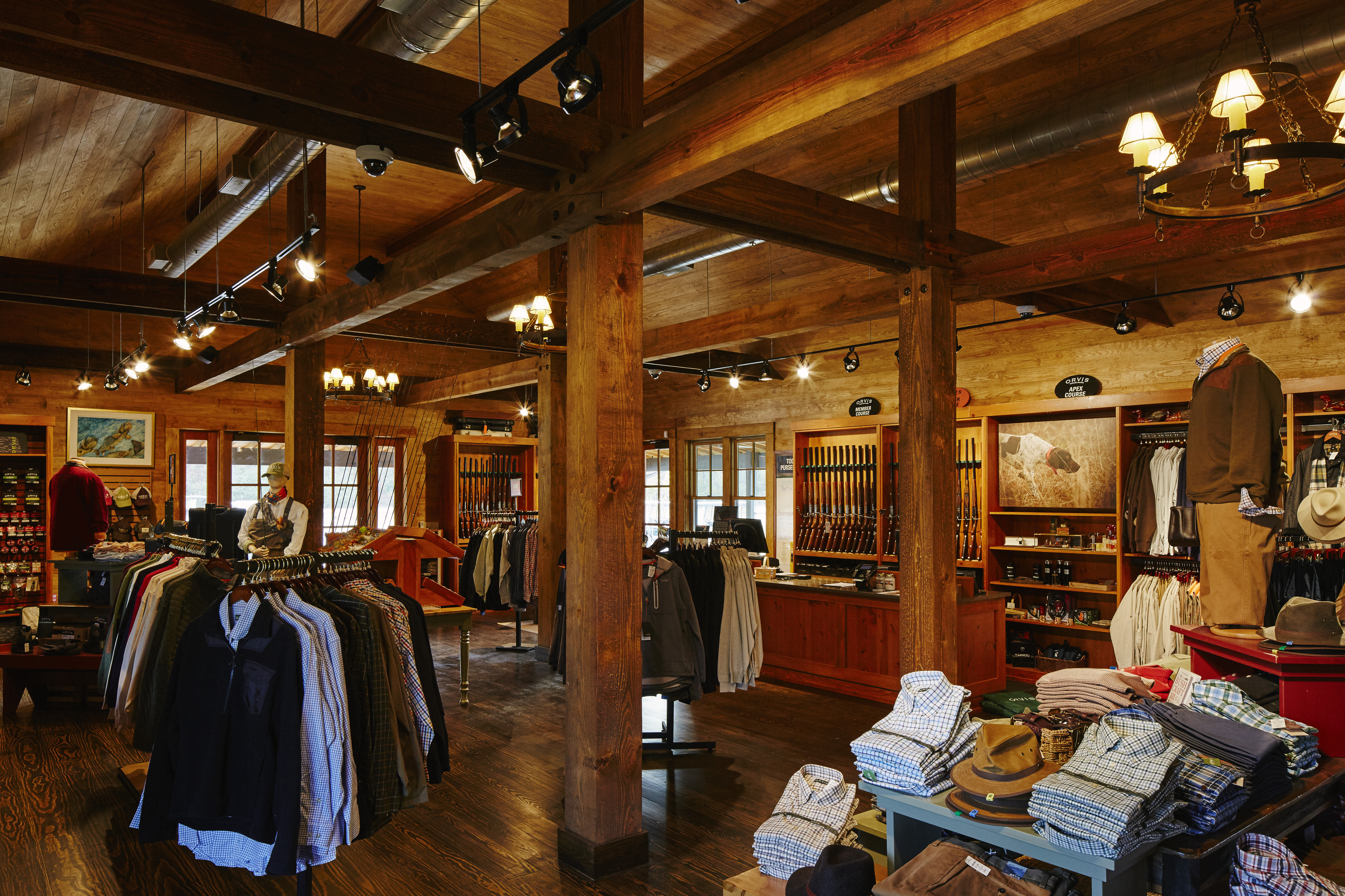 The new building is both an Orvis retail shop and a home-base for the Orvis Shooting Grounds. Inside, heart pine beams and columns boast highly detailed timber joinery. Hunting, sporting clays, or fly-fishing instruction takes place in an indoor classroom before groups head to the grounds for activities.