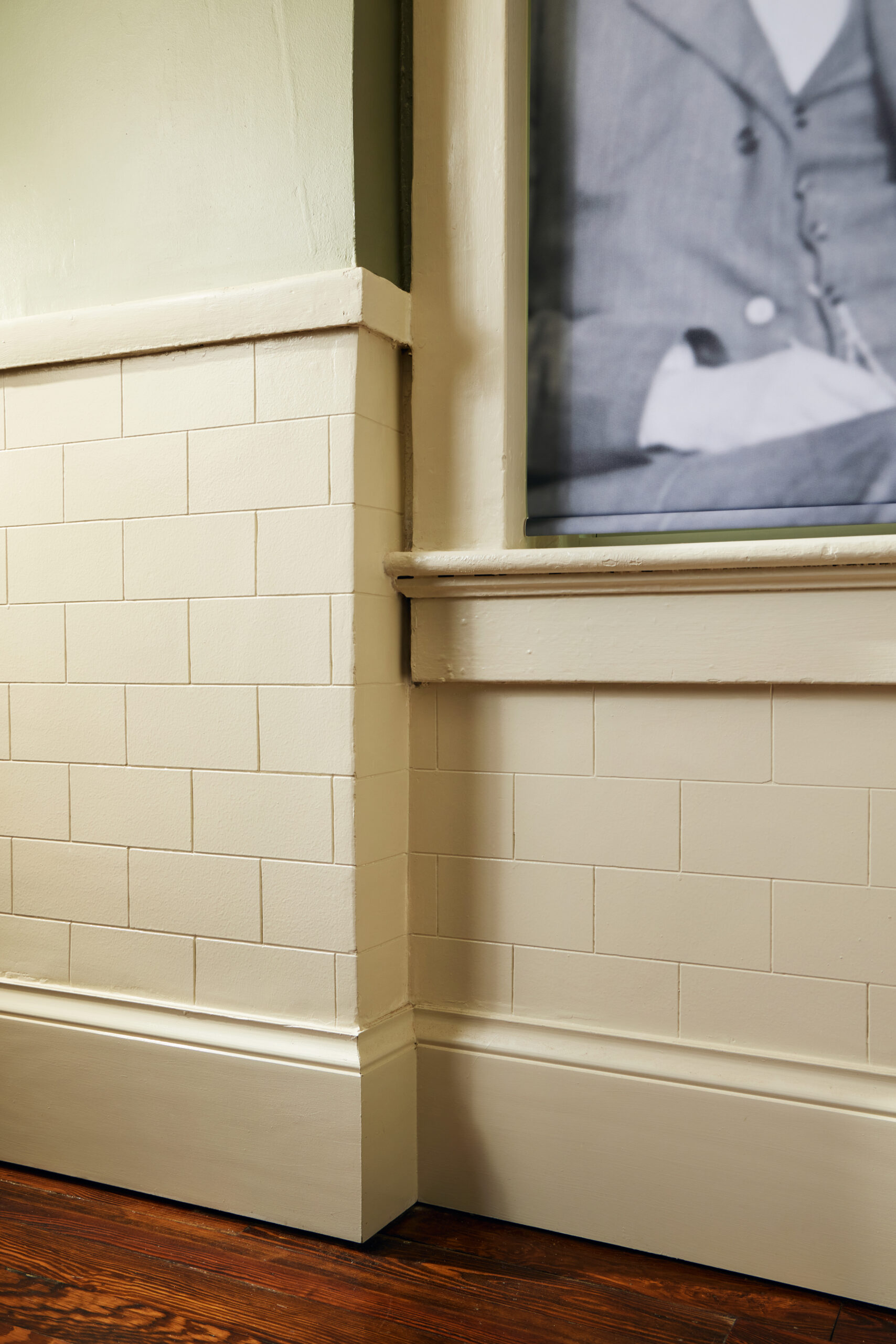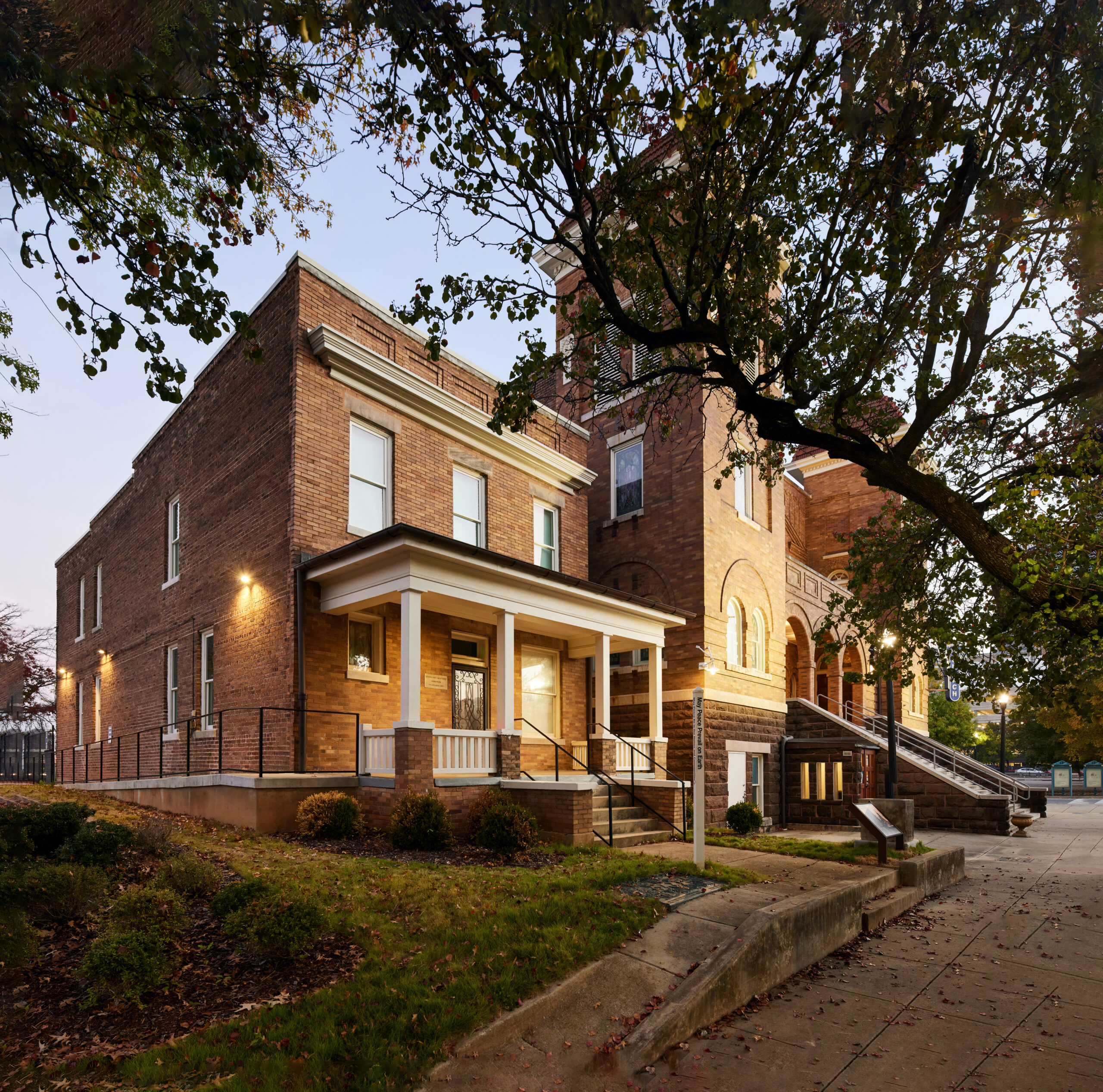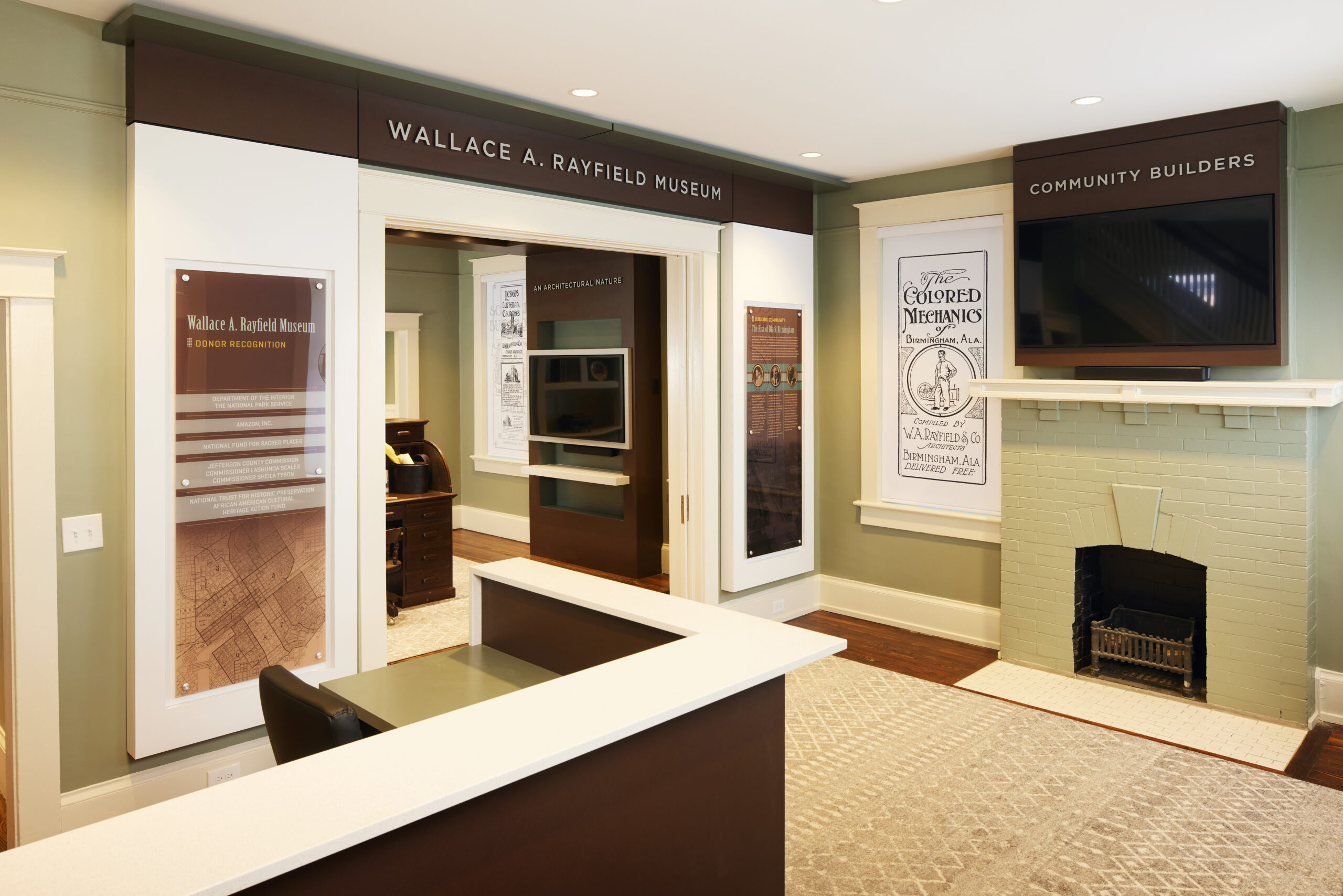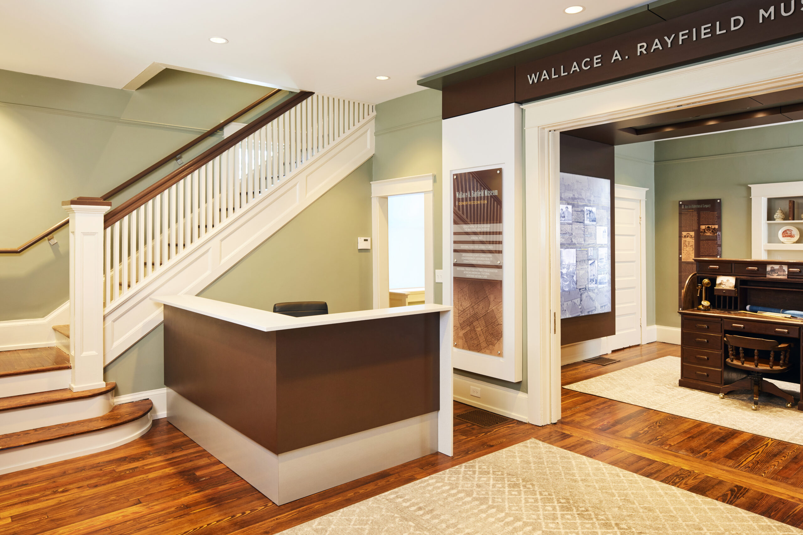 When the building was no longer used as the pastor’s personal home, the building became office space for the church. The program for renovation was to restore the main level to a museum dedicated to Wallace Rayfield, and to use the upper level for church offices. The overall layout of the rooms was preserved and repurposed into multiple exhibit spaces on the main level. The upper level, formerly family bedrooms, is now home to the pastor’s office as well as small meeting rooms for the church. Following the Historic Structures Report, ArchitectureWorks preserved the features of the home such as the living area fireplace, wooden stair balustrade, and built in cabinetry in the dining room. In the kitchen, a particularly handsome scored plaster finish was restored, and in the stair hall, the former telephone bench was refinished.