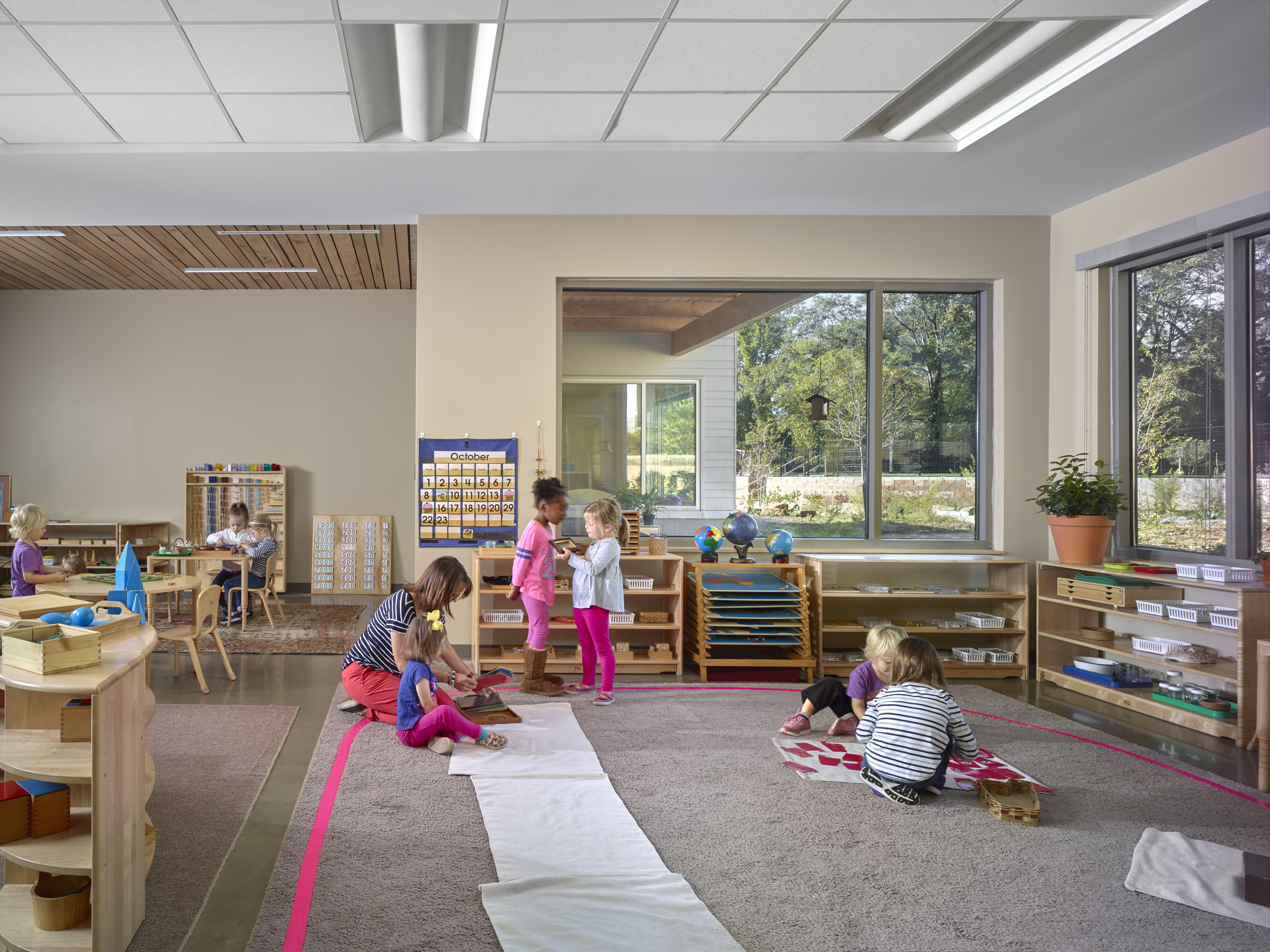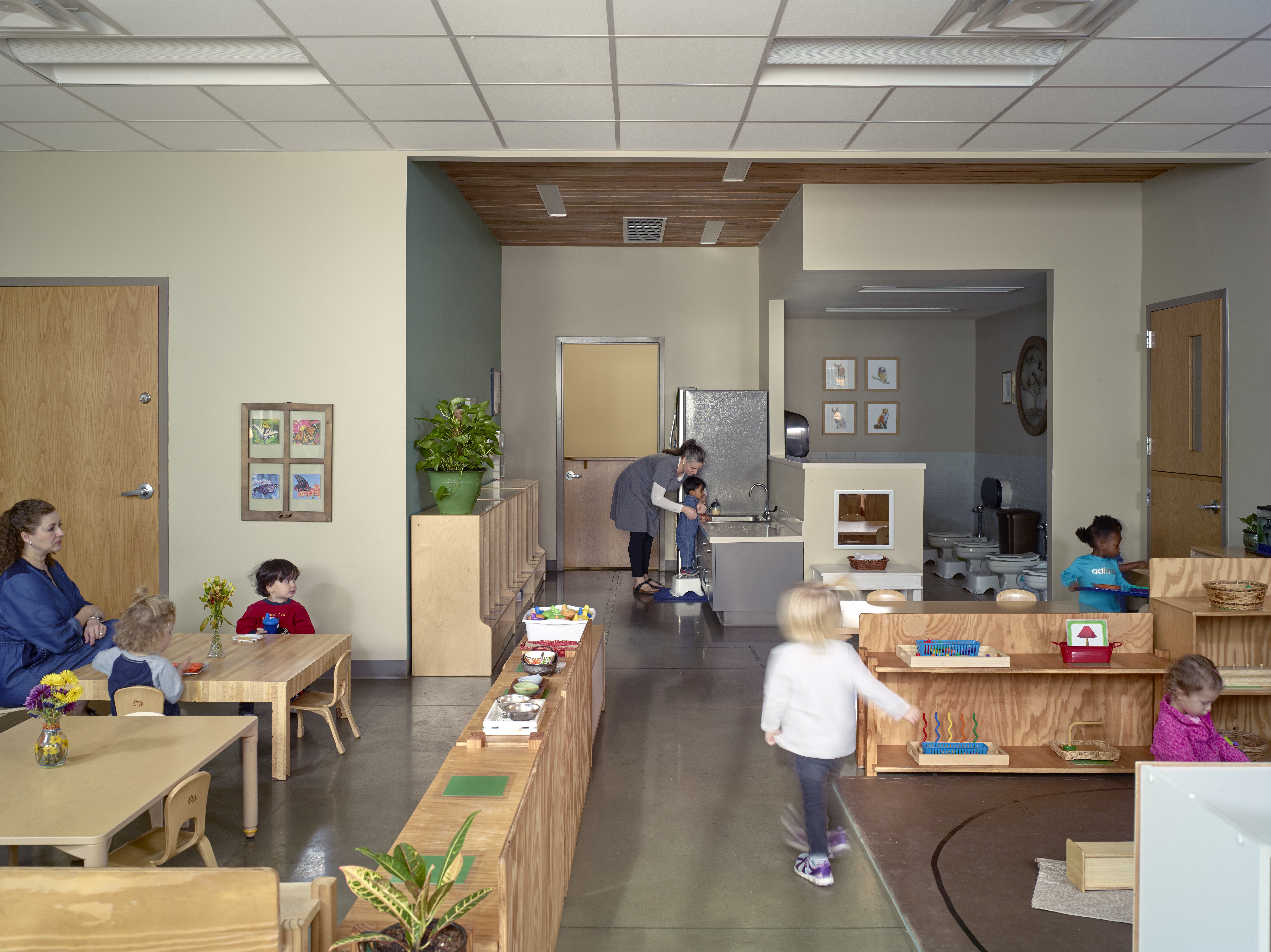 Four new preschool classrooms and two new toddler classrooms, each complete with in-classroom restrooms and kitchenettes, open onto outdoor learning areas with direct access to classroom gardens and play areas. Resource areas, including a library to house the school’s book collection, a language and art classroom, and a multi-purpose room, support the Montessori teaching method and allow for greater community engagement. New landscaping elements, including new play equipment, an outdoor gathering area, and a dry creek bed, further facilitate hands-on learning within a unique physical environment.