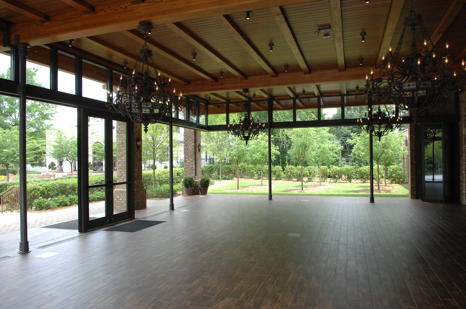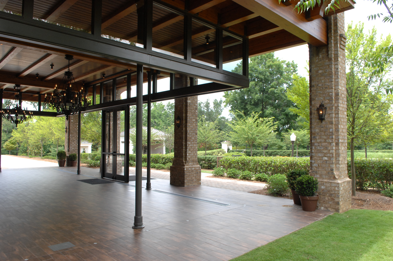 A new porch at the end of the house, with painted brick and detailing that maintains the original character of the house, creates an exterior connection to the formal garden. Alongside the formal garden, a new 4,500 square foot pavilion serves as a large dining and entertainment space. A long brick wall serves as the backdrop for the garden and separates the commercial kitchen, storage, and restrooms from the main entertainment space. A retractable glass wall opens the pavilion on three sides to the garden blurring boundaries between inside and outside, while the brick walls and columns and the wood roof structure blend it seamlessly into the garden.