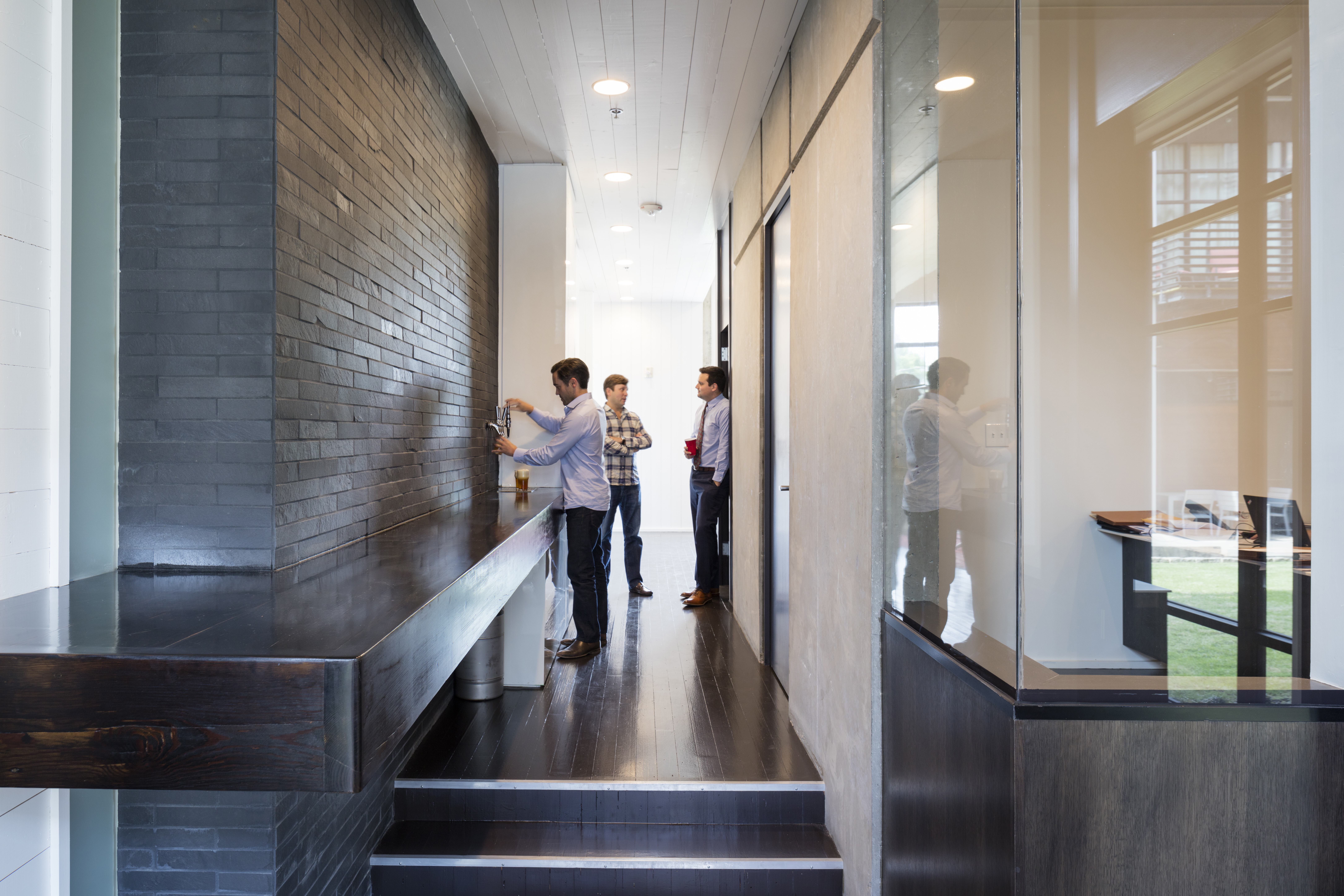 Recognizing a need among sole-practitioner attorneys for good office space and a collegial work environment, attorneys Nick Armstrong and Oscar Price worked with ArchitectureWorks to redevelop a downtown office into a great workplace. The former architecture office had an open plan that didn’t function for legal services, but it also contained significant built elements, such as large concrete walls, that offered design challenges and opportunities. Using a restrained palette of stained oak paneling & glass AW designed a modern workplace, complete with multiple meeting spaces, a lounge, and even a steam shower and beer on tap.